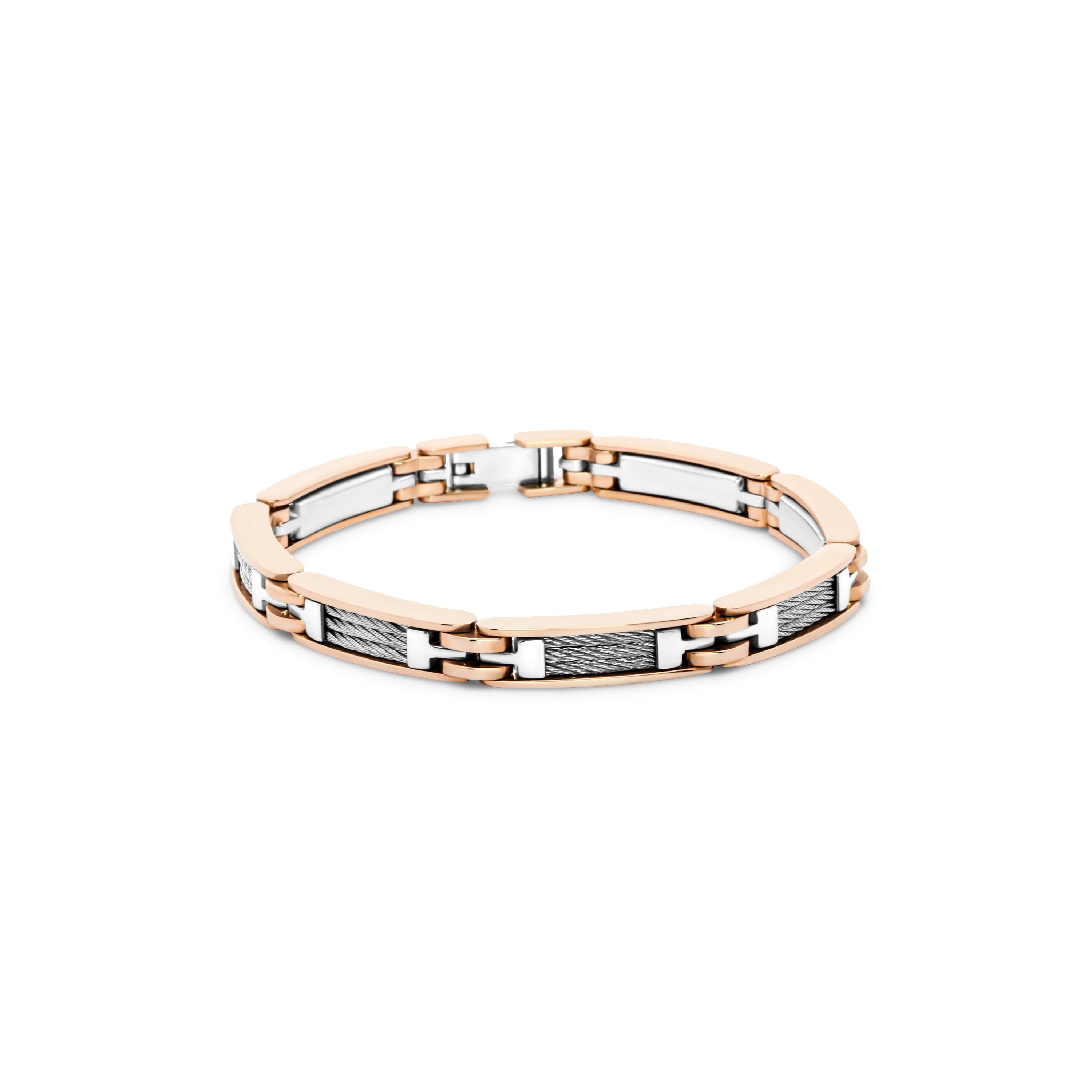 Deze robuuste en stijlvolle herenarmband combineert modern design met industriële details. Vervaardigd uit hoogwaardig edelstaal en verfijnd afgewerkt met roségoudkleurige accenten, straalt dit sieraad zowel kracht als klasse uit. De toevoeging van staaldraad zorgt voor een uniek, technisch geïnspireerd karakter dat perfect past bij de moderne man.
