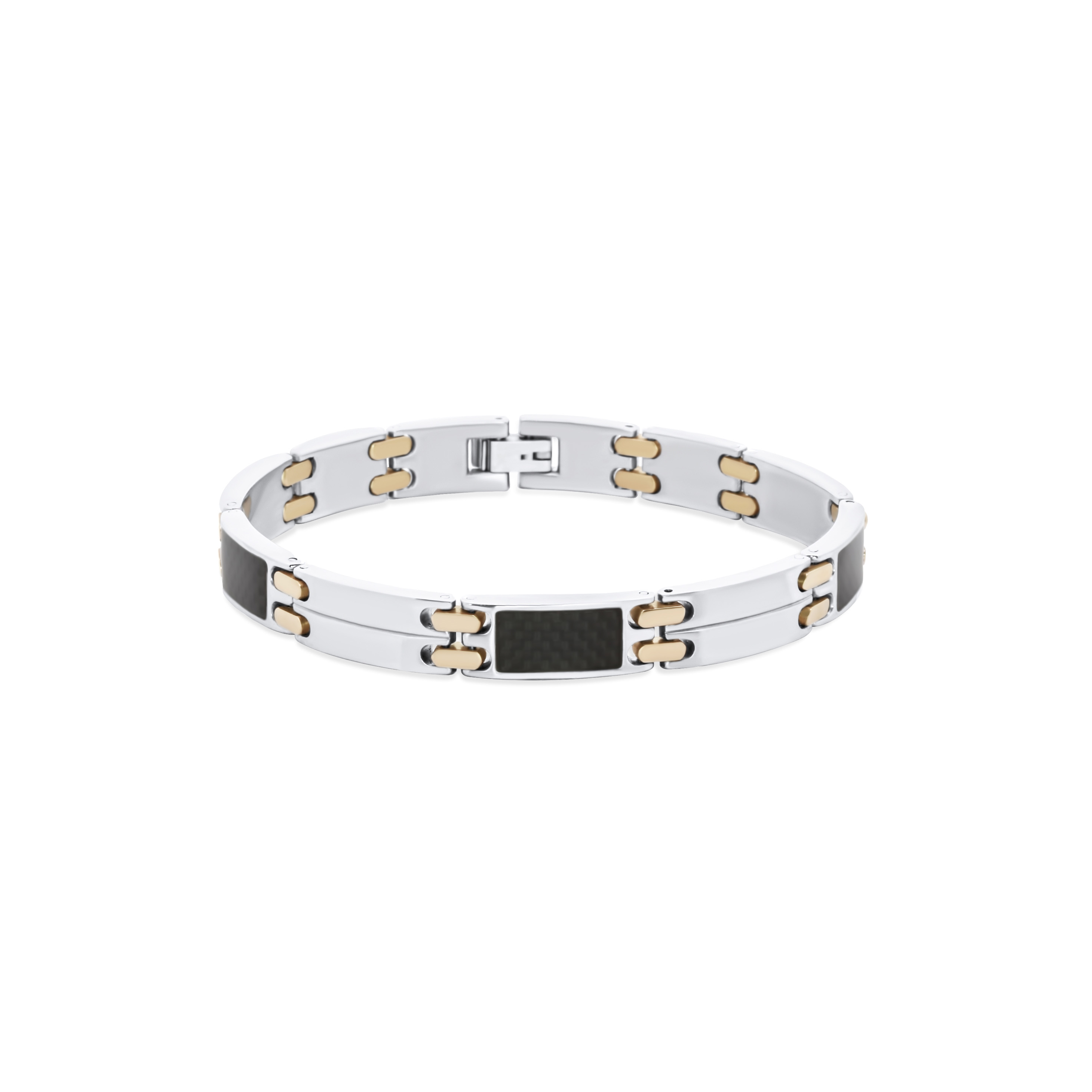 Deze moderne herenarmband combineert luxe en technologie in één krachtig ontwerp. Het geelgouden detail zorgt voor een verfijnde, warme glans, terwijl het edelstaal de armband een stoere en duurzame basis geeft. Het gebruik van carbon voegt een eigentijdse, sportieve touch toe, met een high-tech uitstraling.