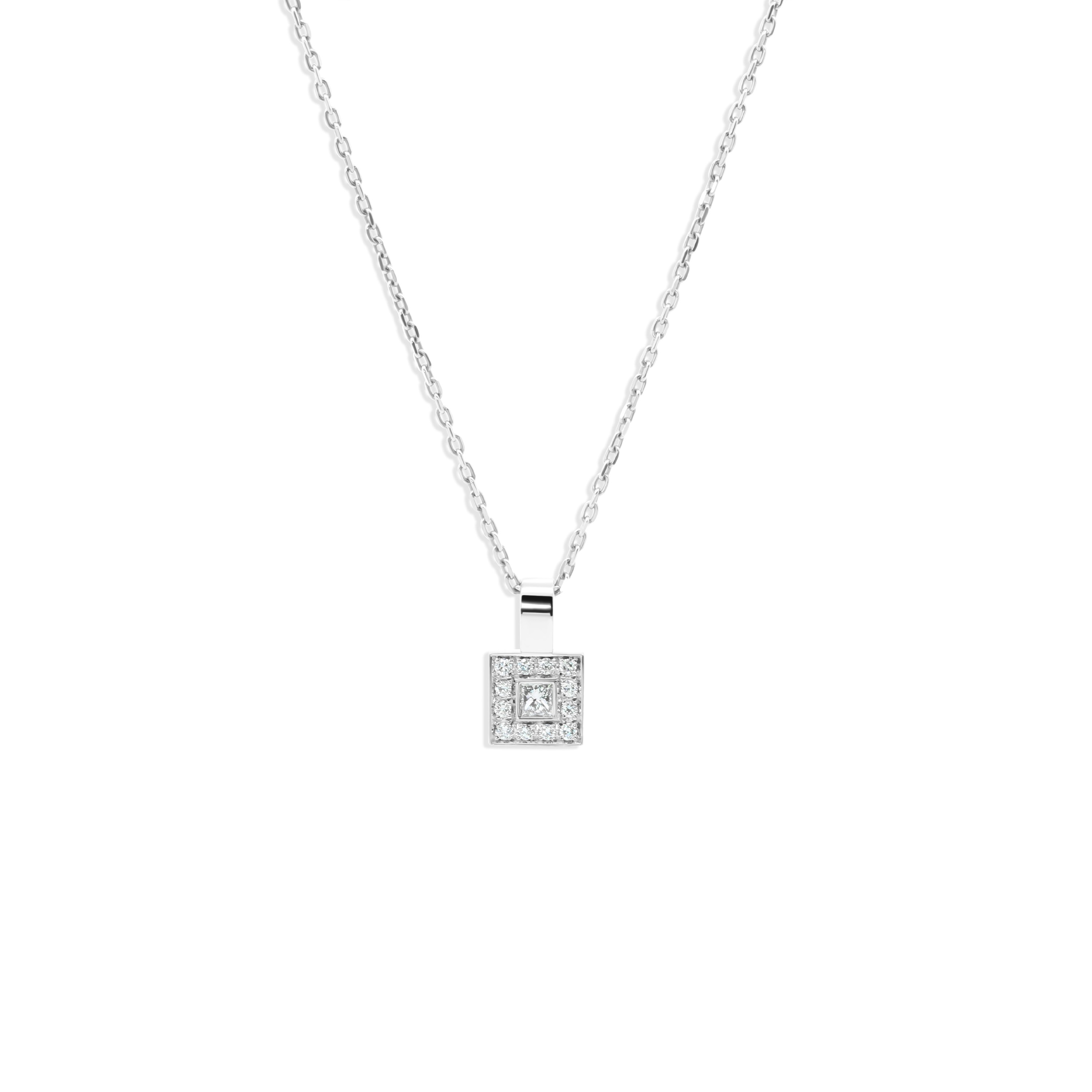 Strakke en stijlvolle hanger van witgoud, gezet met een vierkante witte lab-grown diamant van 0,36 ct. De moderne vorm in combinatie met de heldere schittering geeft het sieraad een elegante en eigentijdse uitstraling.