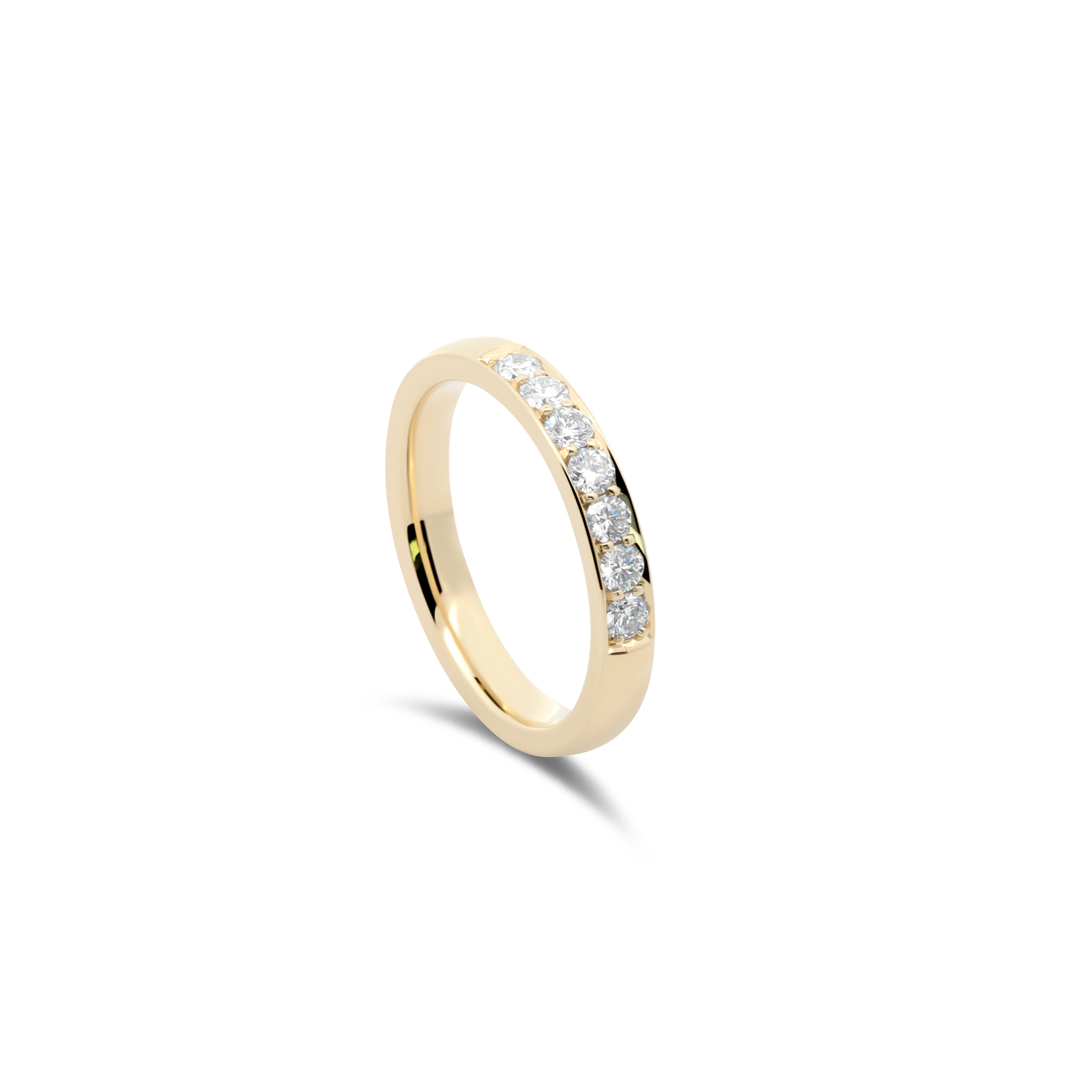 Zeven fonkelende witte stenen van elk 2,55 ct komen samen in een prachtig symmetrisch ontwerp. Gezet in warm geel goud, vangen de lab-gegroeide edelstenen het licht met een briljante zuiverheid – duurzaam én ethisch verantwoord.