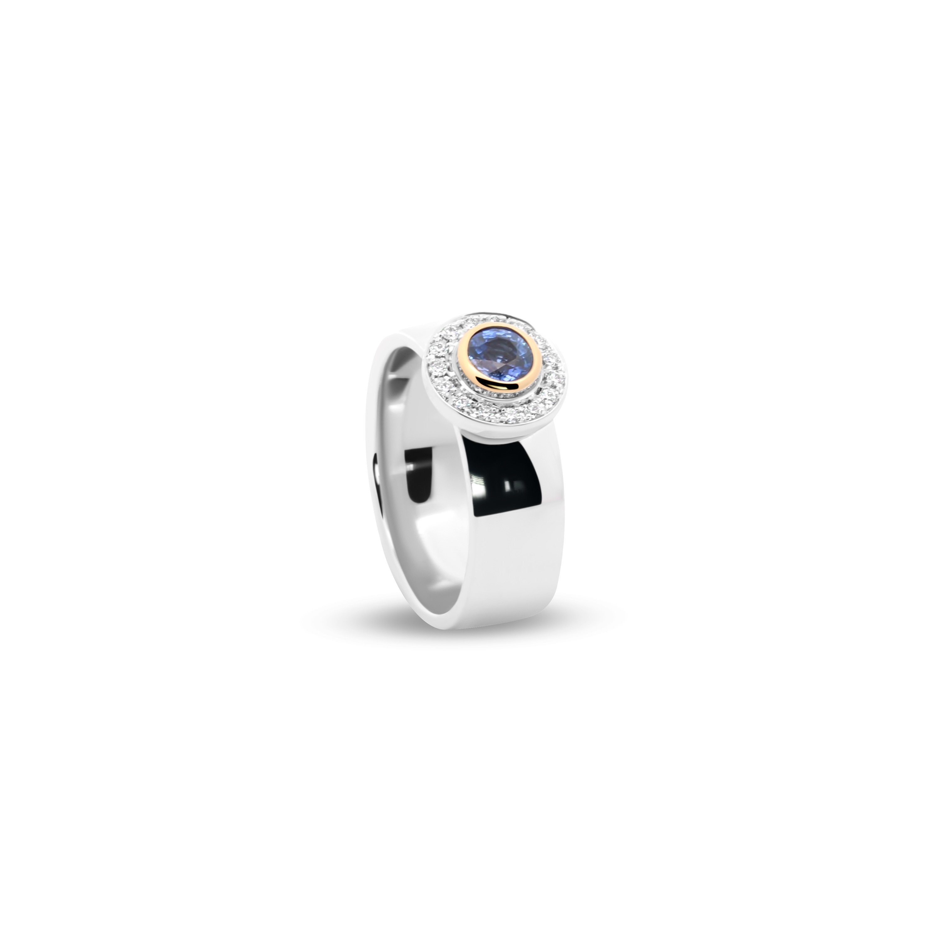 Voeg een vleugje klasse toe aan je sieradencollectie met deze schitterende ring. Het middelpunt van de ring wordt gevormd door een prachtige ronde blauwe saffier, stijlvol omlijst met geelgoud. De omliggende pavé gezette diamanten zorgen voor een subtiele maar verfijnde schittering, waardoor dit sieraad een echte blikvanger is.