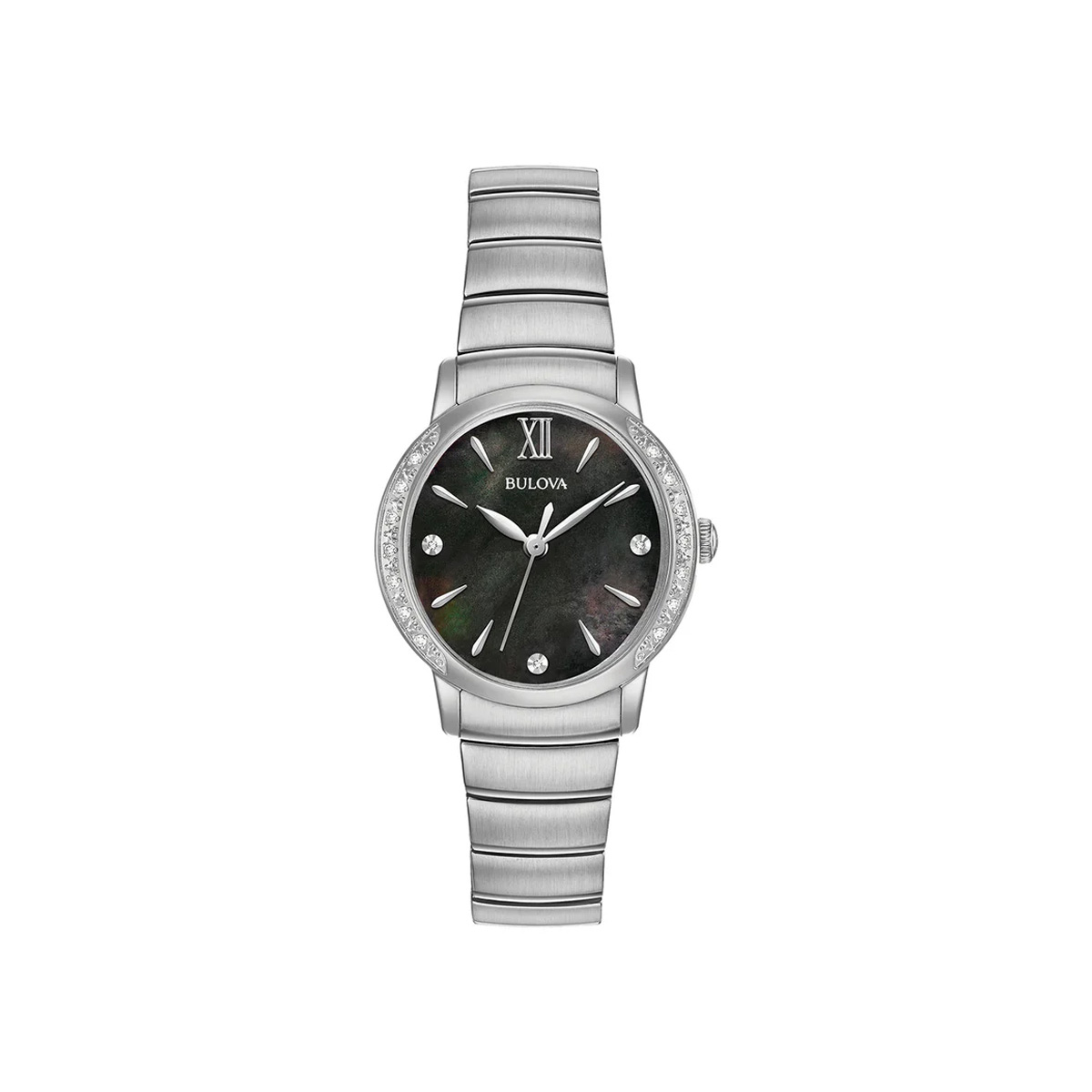 Dit Bulova dameshorloge heeft een zwarte parelmoer wijzerplaat met schitterende diamantdetails, terwijl ook de kast is voorzien van diamanten. Deze combinatie maakt het horloge tot een echte eyecatcher, perfect voor wie luxe en elegantie wil uitstralen.