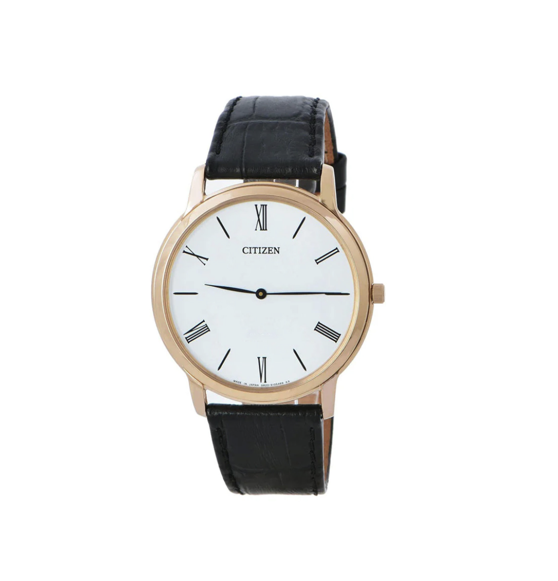 De Citizen AR1113-04B is een ultraslank herenhorloge uit de Eco-Drive Stiletto serie, bekend om zijn lichtaangedreven technologie en elegante design. Het horloge kenmerkt zich door een roségoudkleurige kast, een witte wijzerplaat en een zwarte leren band.