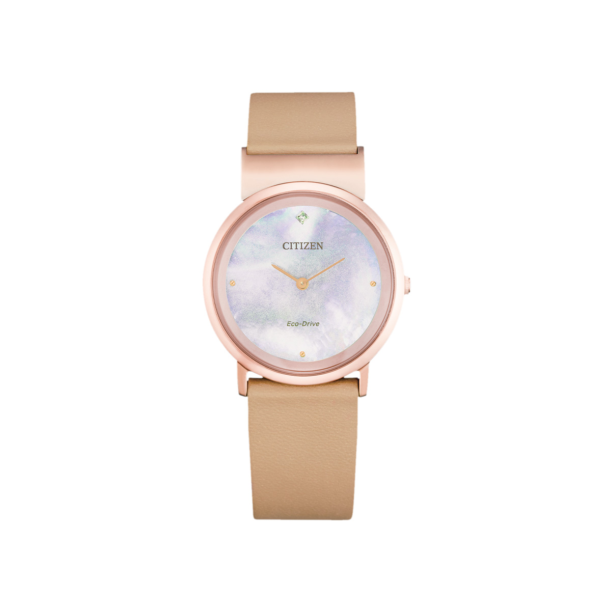 Dit Citizen dameshorloge heeft een rosékleurige kast en een parelmoeren wijzerplaat, verrijkt met een opvallende groene diamant. De leren band maakt het horloge stijlvol en comfortabel, perfect voor een elegante en unieke look.