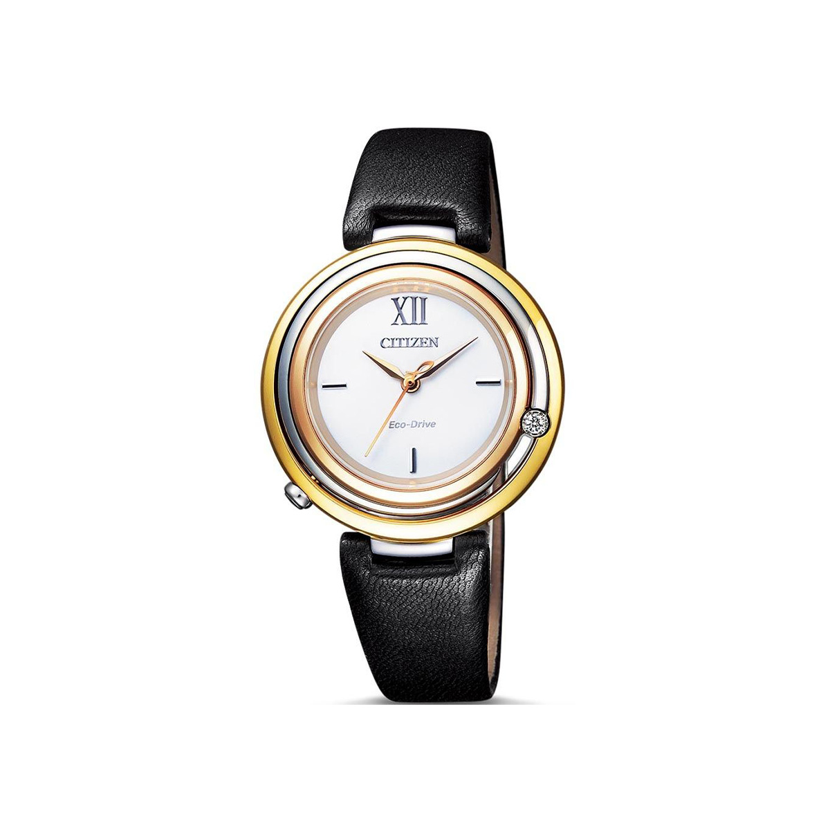 Dit Citizen Eco-Drive dameshorloge heeft een zwarte leren band en een kast in geel- en zilverkleurige tinten. Een subtiele diamant in de kast voegt een vleugje elegantie toe, waardoor het horloge stijlvol en tijdloos is, ideaal voor dagelijks gebruik en speciale gelegenheden.
