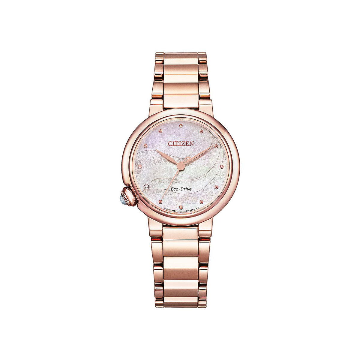 Dit rosékleurige Citizen dameshorloge heeft een unieke parelmoeren wave-wijzerplaat, waarin één schitterende diamant is verwerkt. Het horloge straalt elegante verfijning uit en is perfect voor wie op zoek is naar een tijdloos en bijzonder sieraad.