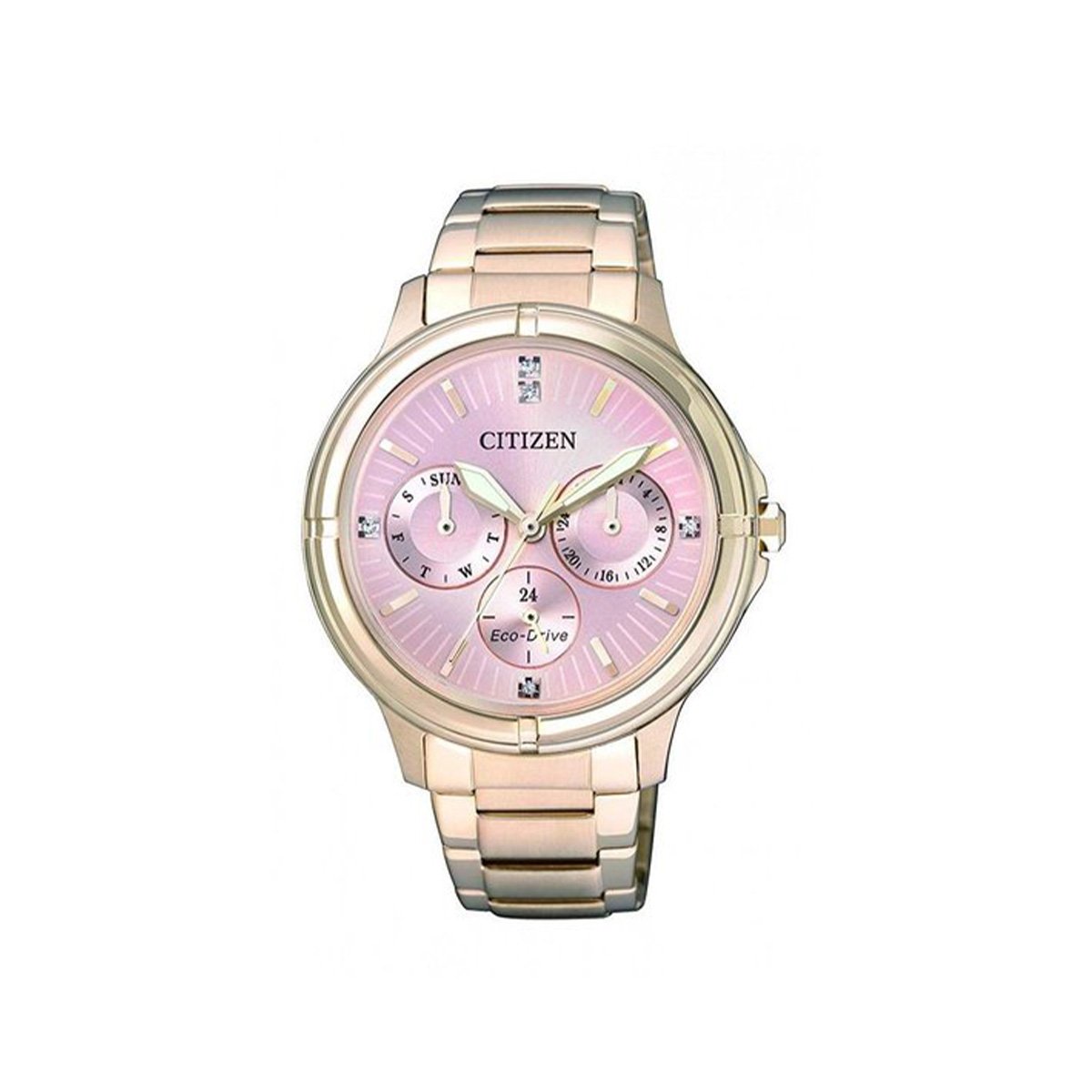 Citizen FD2033-52W dameshorloge uit de Eco-Drive collectie, voorzien van roségouden kast en edelstalen band met vouwsluiting. Het horloge werkt op zonne-energie en is waterbestendig tot 50 meter (5 ATM). De wijzerplaat wordt beschermd door mineraalglas. De verstelbare band heeft een breedte van 18-16 mm en past om polsen van 14,5 tot 19,5 cm. Lichtgewicht en stijlvol, perfect voor dagelijks gebruik.