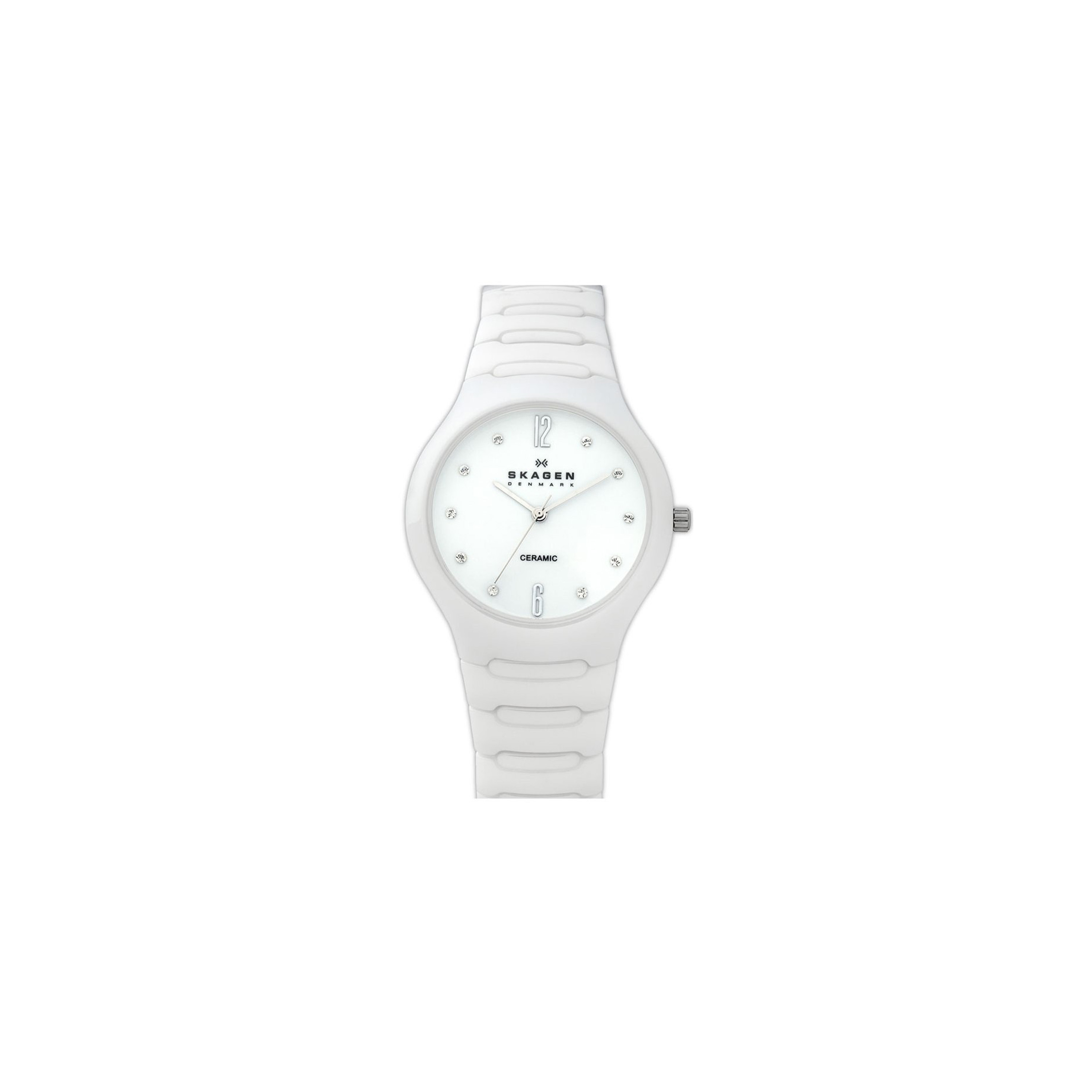 Dit Skagen Denmark dameshorloge is uitgevoerd in wit keramiek en voorzien van diamantdetails op de wijzerplaat, wat het een moderne en verfijnde uitstraling geeft.