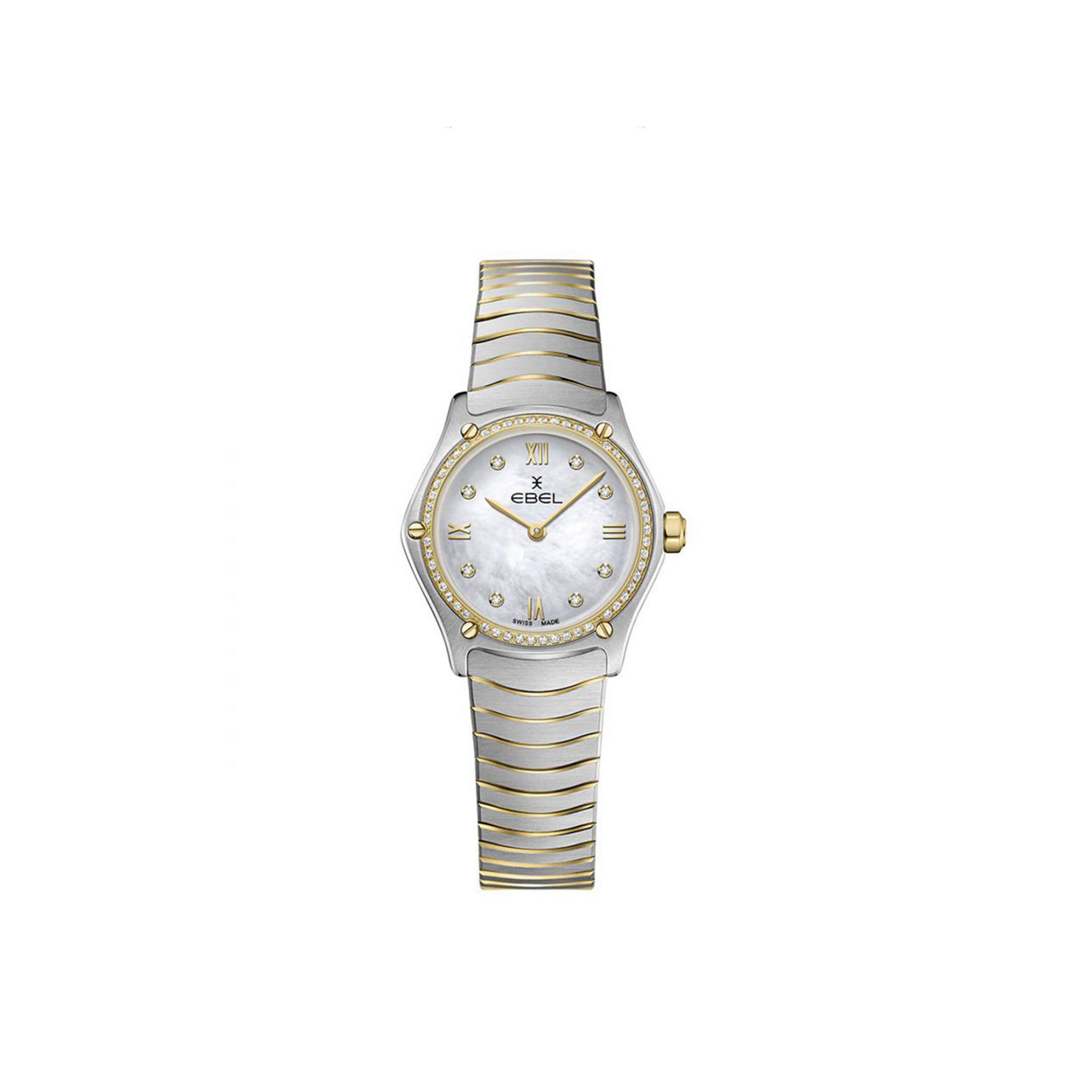 Dit EBEL Sport Classic Mini dameshorloge heeft een kast van roestvrij staal en 18-karaats geelgoud, versierd met diamanten voor een luxe uitstraling. De witte parelmoeren wijzerplaat met Romeinse cijfers en diamanten combineert elegantie met stijl. Het horloge draait op een betrouwbaar Zwitsers quartz uurwerk, is waterbestendig tot 50 meter en heeft een comfortabele twee-tone roestvrijstalen armband met opvouwsluiting.