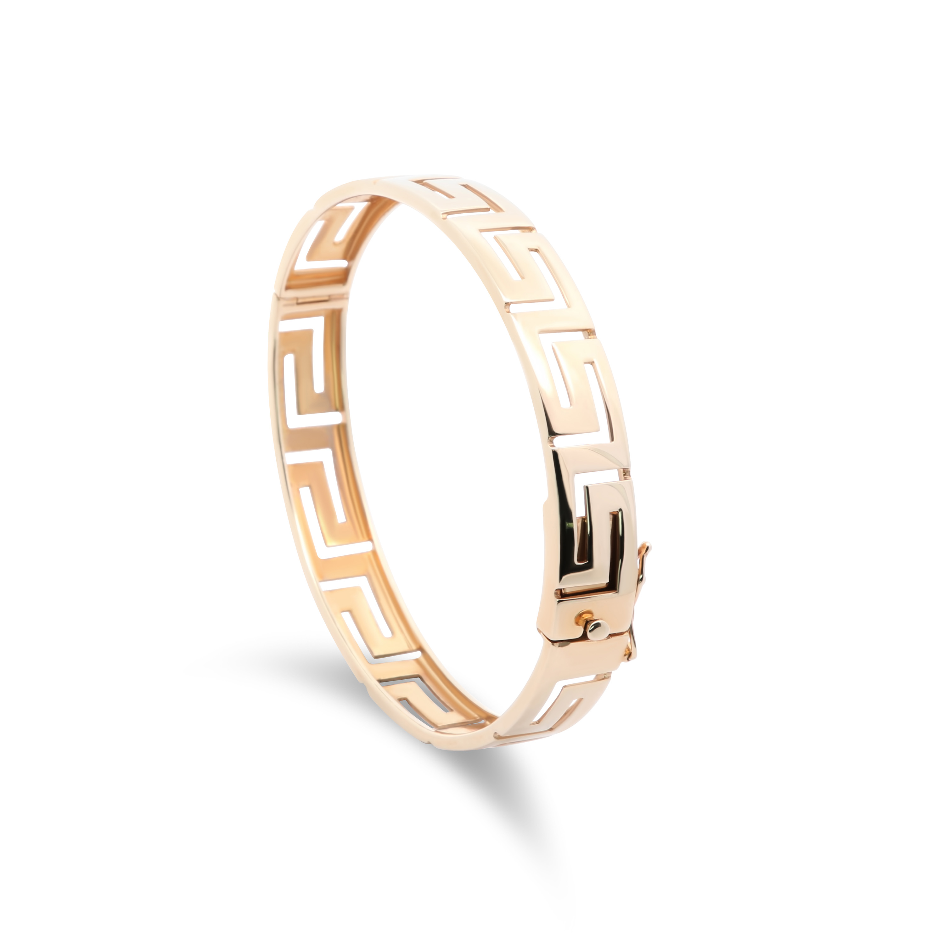 Deze schitterende geelgouden bangle combineert tijdloze klasse met een vleugje oudheid. Het opengewerkte patroon, geïnspireerd op klassieke Griekse ornamenten, siert de gehele armband en geeft het sieraad een elegante en verfijnde uitstraling. Dankzij de combinatie van vakmanschap en cultuur is dit een unieke toevoeging.