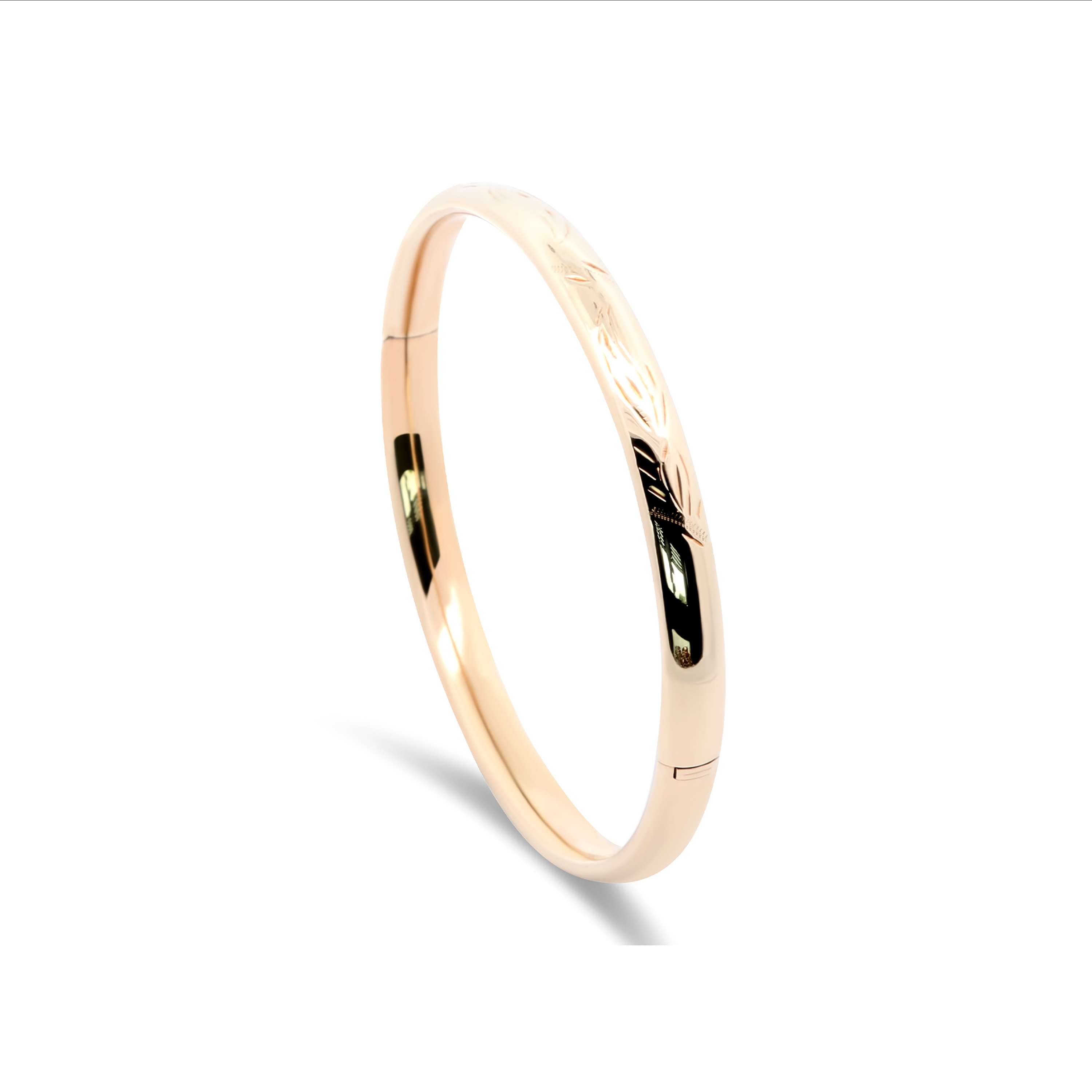 Deze bangle-armband van 14 karaat geelgoud combineert klassieke elegantie met verfijnde natuurlijke elementen. De stijve, ovale vorm sluit mooi om de pols, terwijl de bovenkant is versierd met een subtiel gegraveerd bloemen- of bladpatroon, geïnspireerd op de organische schoonheid van de natuur.