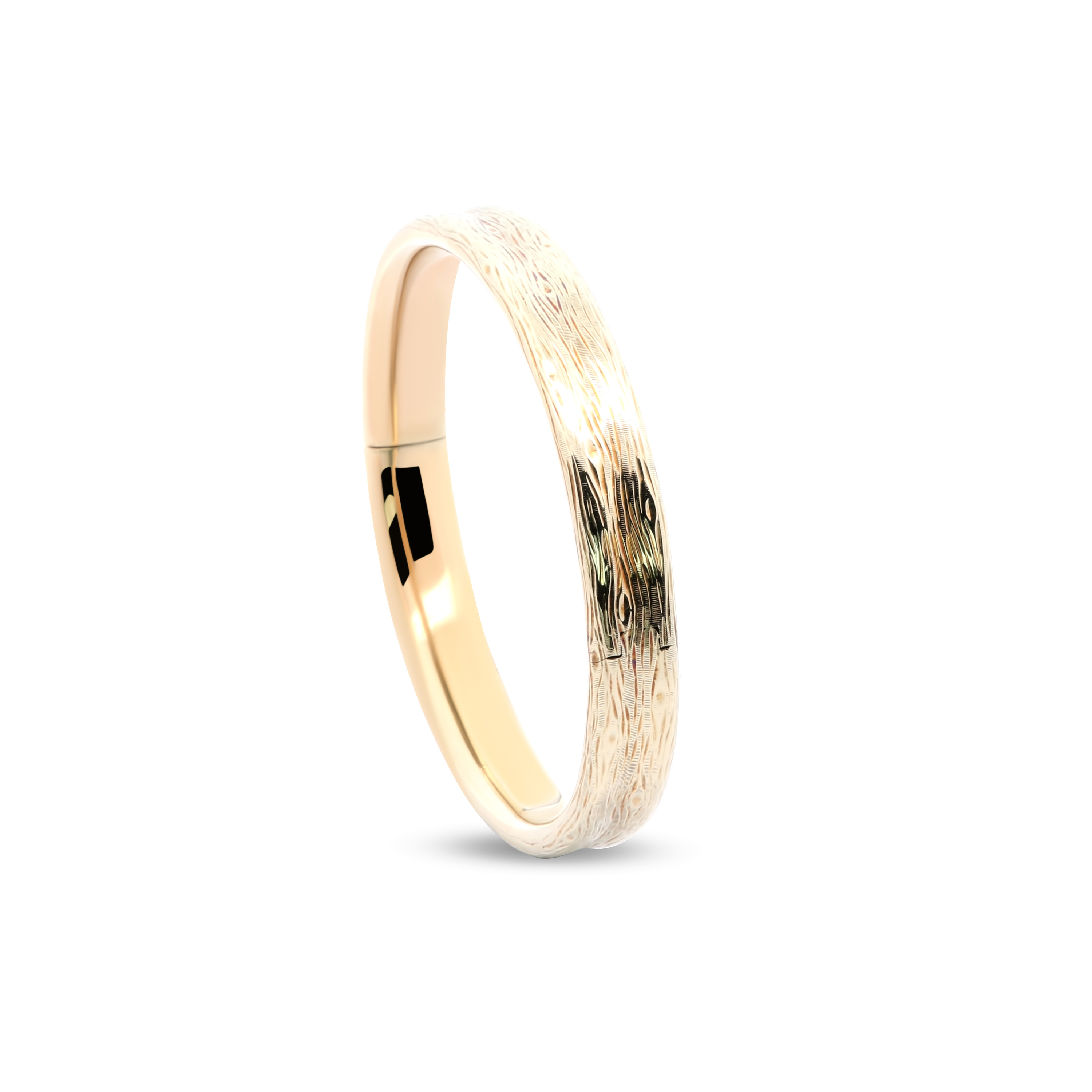 Deze unieke bangle-armband van 14 karaat geelgoud combineert tijdloos vakmanschap met een verrassend natuurlijk accent. Het stijve, ovale ontwerp is volledig voorzien van een subtiele houtprint die het hele oppervlak siert. Deze bijzondere textuur geeft de armband een warme uitstraling en een unieke, organische touch.