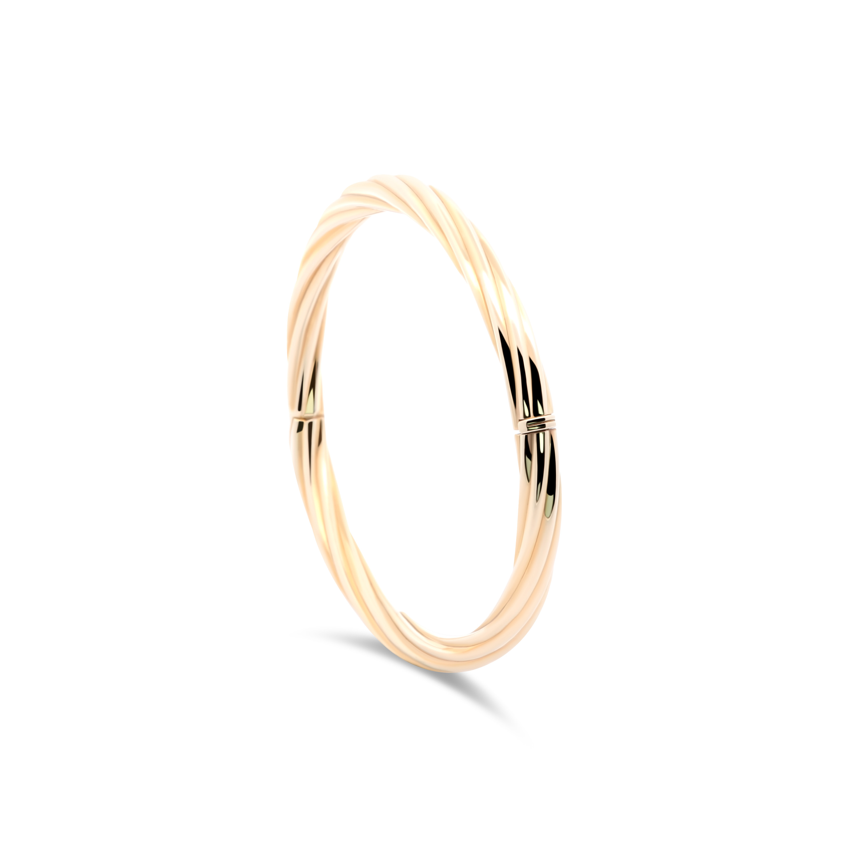 Deze bangle-armband van 14 karaat geelgoud valt op door zijn unieke twisted design. De gedraaide vorm geeft de stijve armband een speelse en dynamische uitstraling, terwijl het glanzende oppervlak zorgt voor een luxueuze finish.