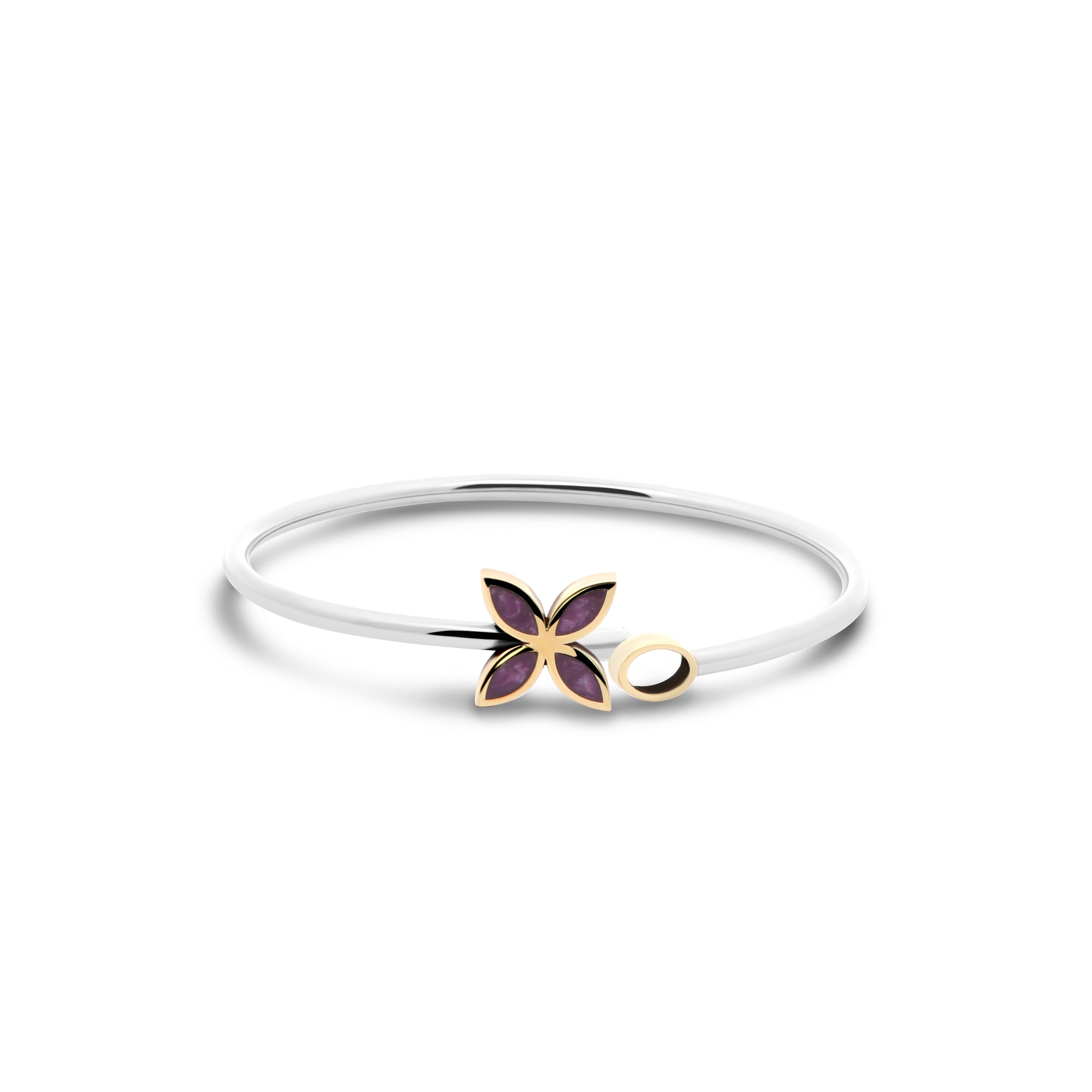 Laat je pols stralen met dit verfijnde armbandje, uitgevoerd in wit goudl en afgewerkt met een delicate bloem in glanzend paarse keramiek. De bloem, met haar vier perfect gevormde blaadjes omlijst in goud, straalt een ingetogen luxe uit. Een speels ovaal detail in geelgoud maakt het ontwerp helemaal af, en zorgt voor een moderne twist aan dit vrouwelijke sieraad.