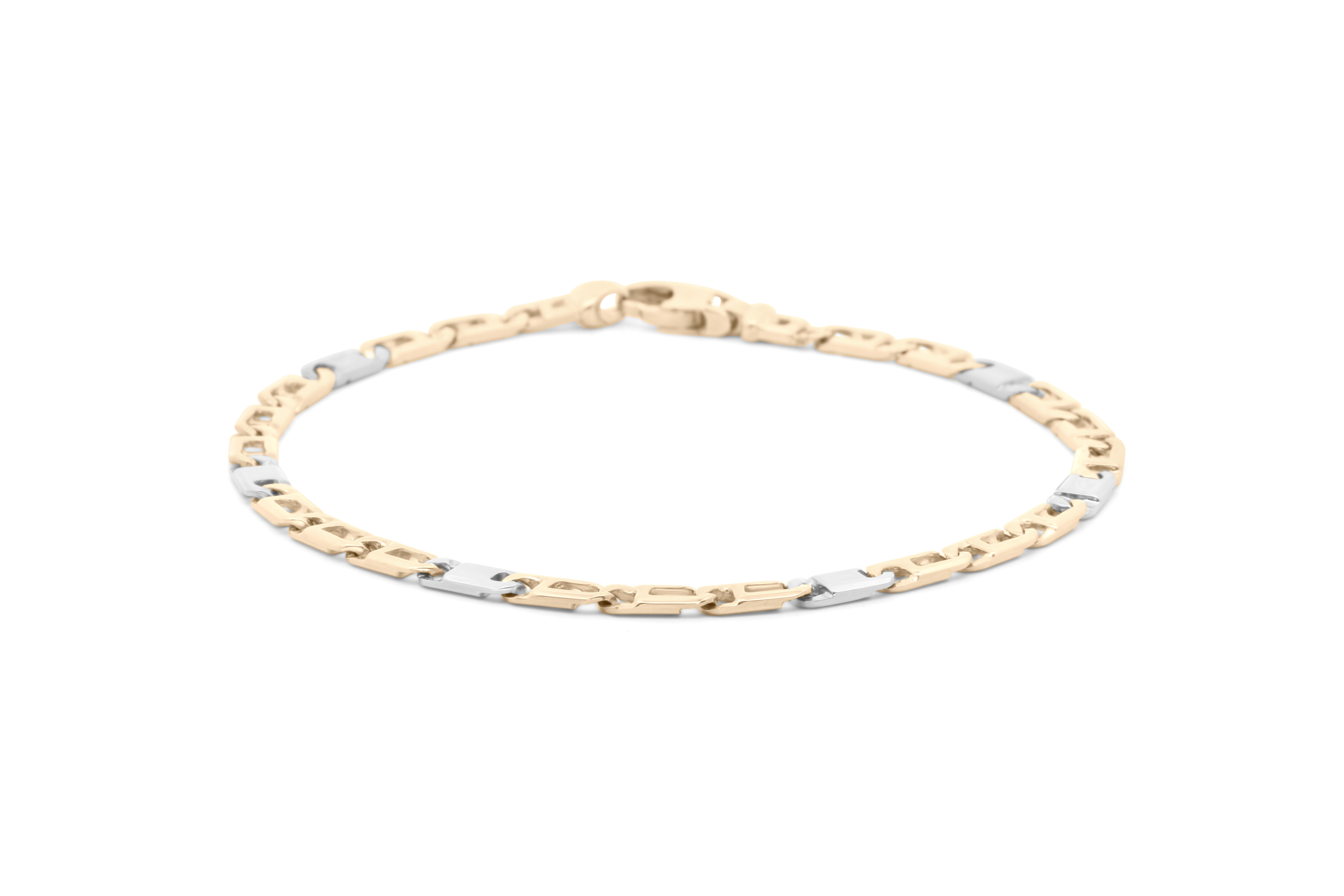 Deze bicolor armband heeft een speelse schakel. Vervaardigd uit 14krt wit en- geelgoud.