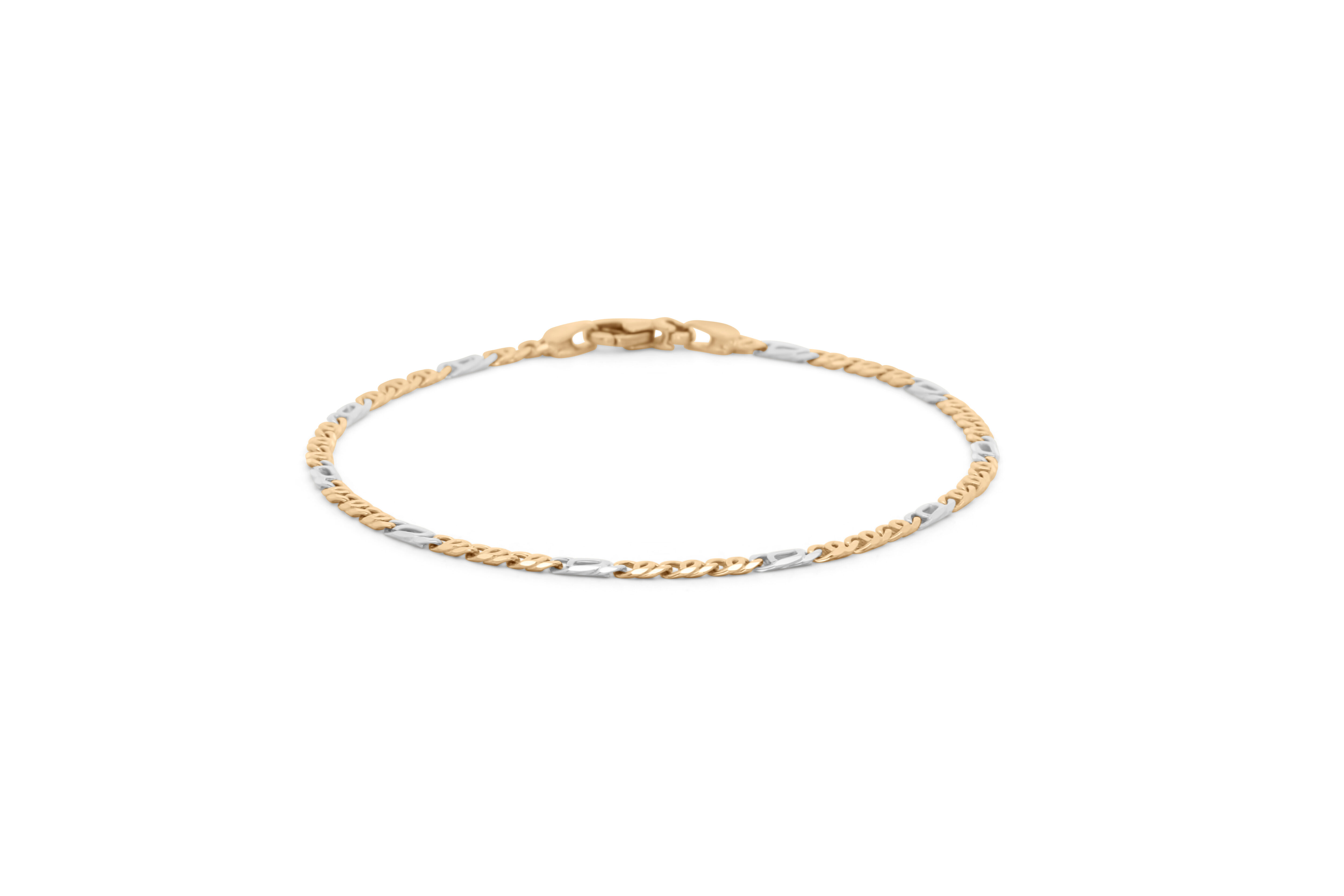 Deze exclusieve armband van 14 karaat wit en geel goud is een krachtig en elegant statement. Het contrast tussen het warme geel goud en het koele wit goud geeft het sieraad een moderne, luxueuze uitstraling. De valkenoogschakel – robuust en verfijnd – zorgt voor een unieke, gedetailleerde structuur die direct in het oog springt.