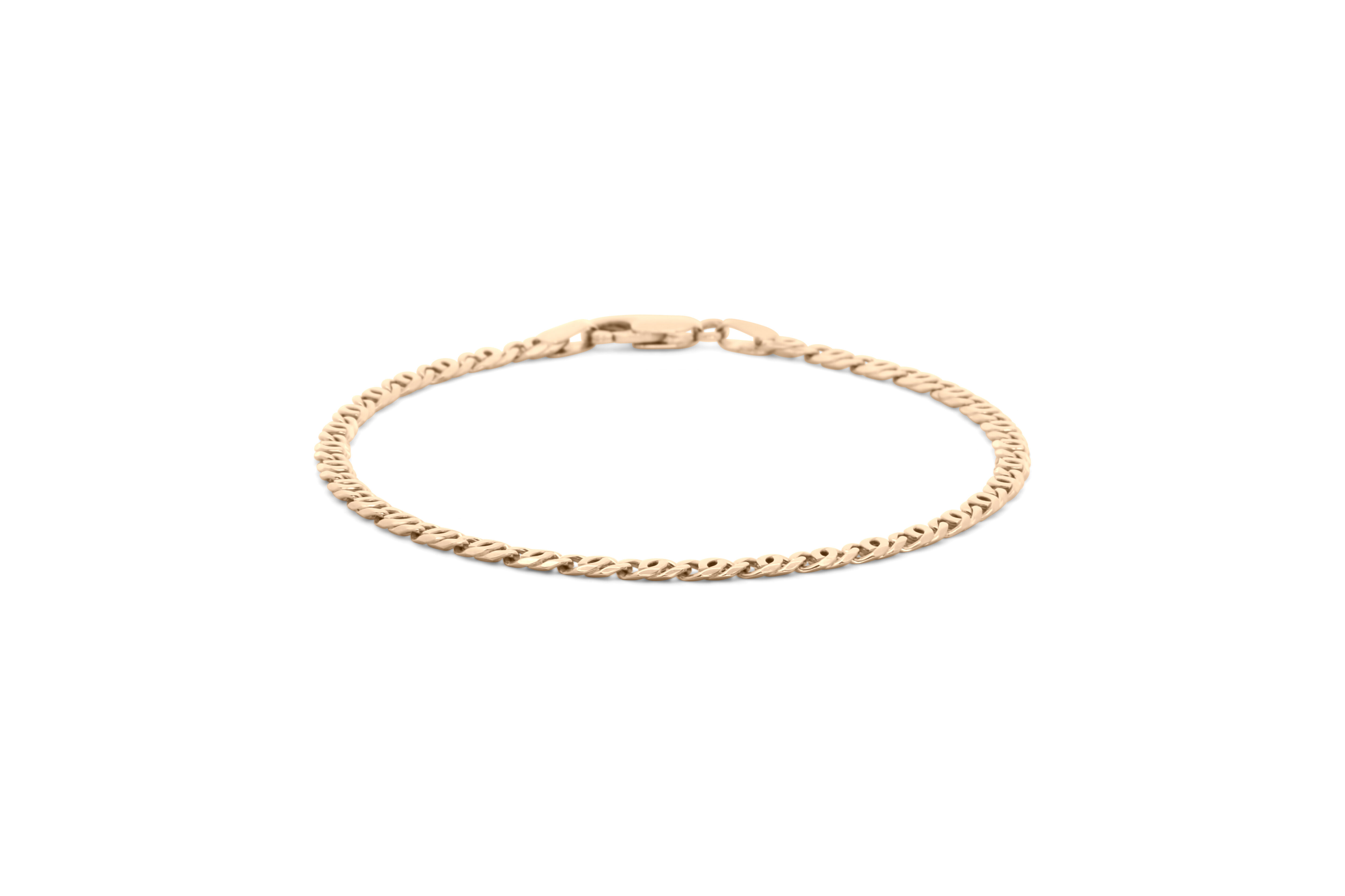 Deze armband van 14 karaat geel goud met Valkenoogschakel kenmerkt zich door zijn opvallende, hoekige schakels. Het ontwerp geeft de armband een stoere en verfijnde uitstraling.