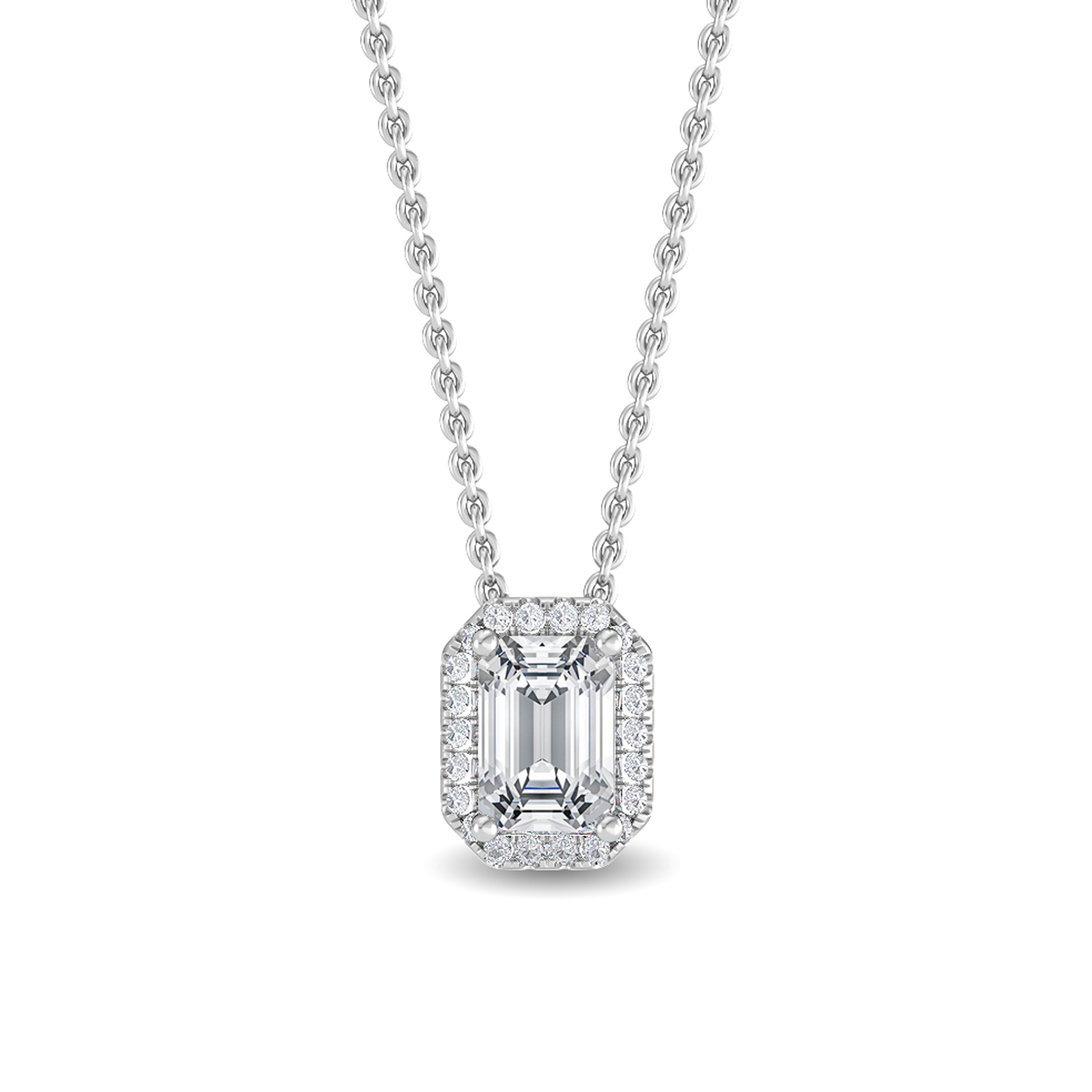 Deze schitterende emerald cut hanger straalt pure elegantie en verfijning uit. De centraal geplaatste, rechthoekig geslepen steen benadrukt zuiverheid en diepte, omgeven door een sprankelende halo van ronde diamanten die het licht vangen vanuit elke hoek.