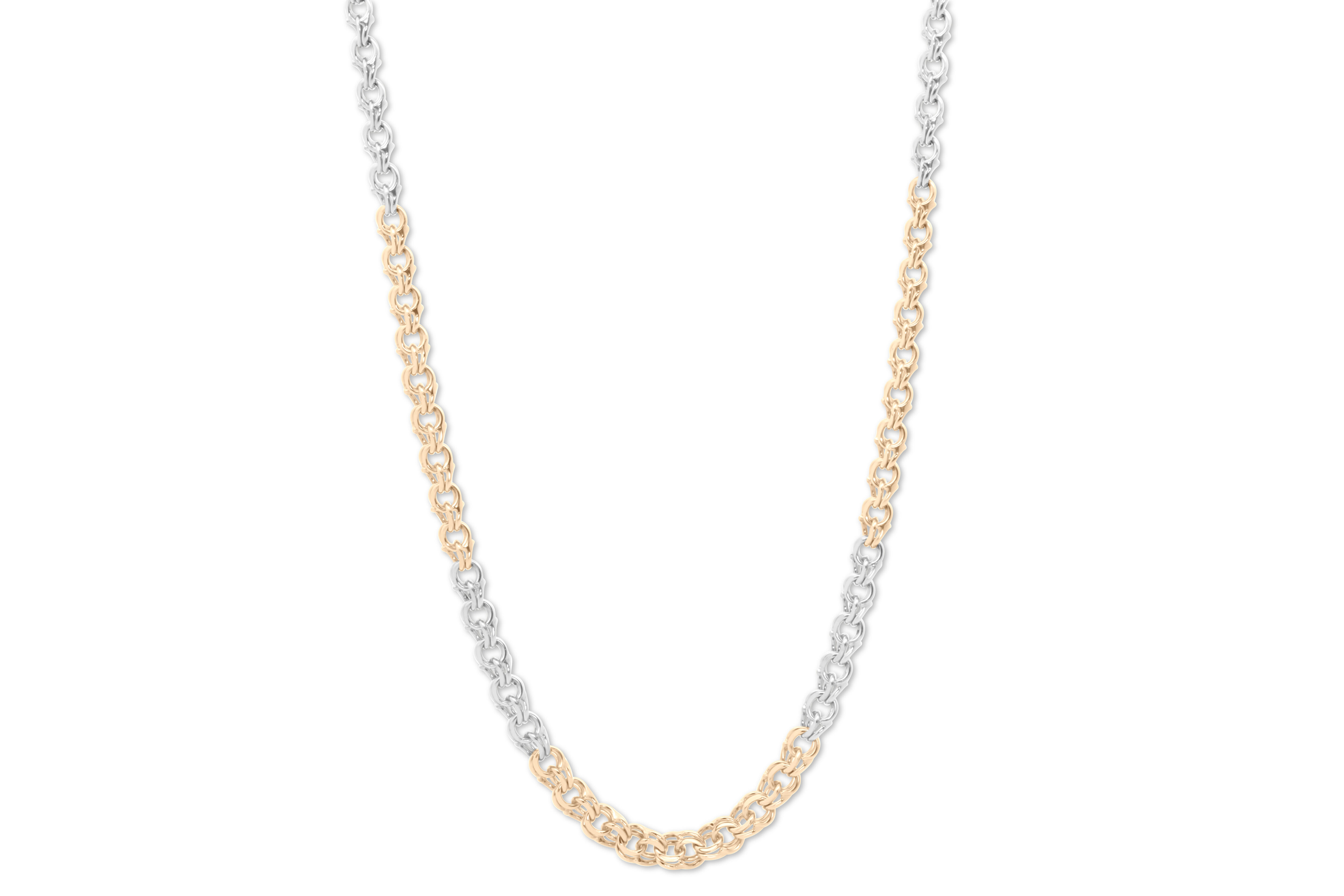 Deze 14 karaat fantasie ketting in geel en witgoud is een bijzonder en stijlvol sieraad. De schakels hebben een speels en uniek patroon, waarbij het contrast tussen geel en witgoud zorgt voor een opvallend en elegant effect.