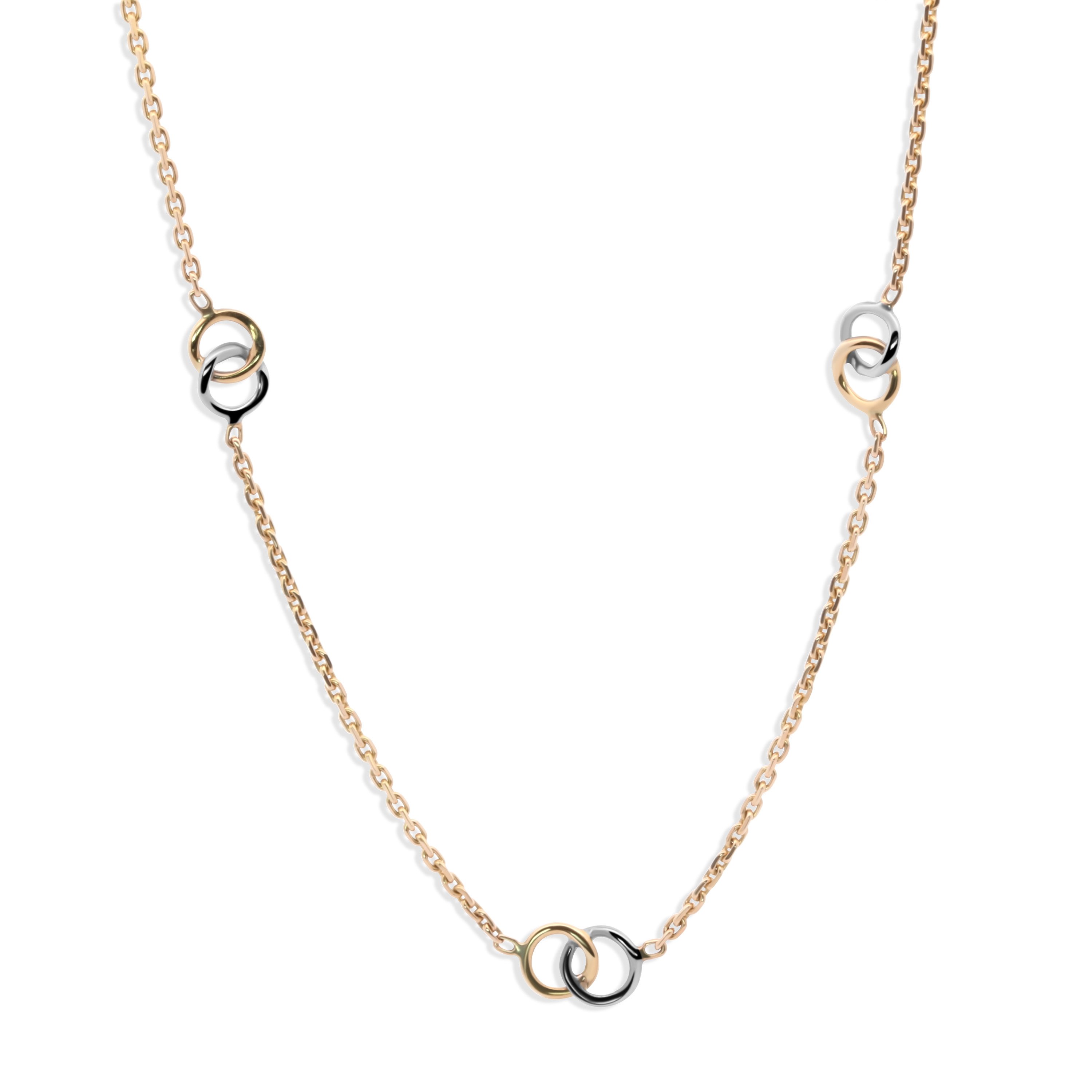 Deze verfijnde fantasieketting is een waar kunstwerk van goudsmeden. Gemaakt van 14 karaat wit- en geelgoud straalt deze ketting pure elegantie en vakmanschap uit. De ketting is 45 cm lang en is voorzien van een uniek ontwerp met drie sets van twee in elkaar verstrengelde cirkels – een krachtig symbool voor verbondenheid, balans en harmonie.