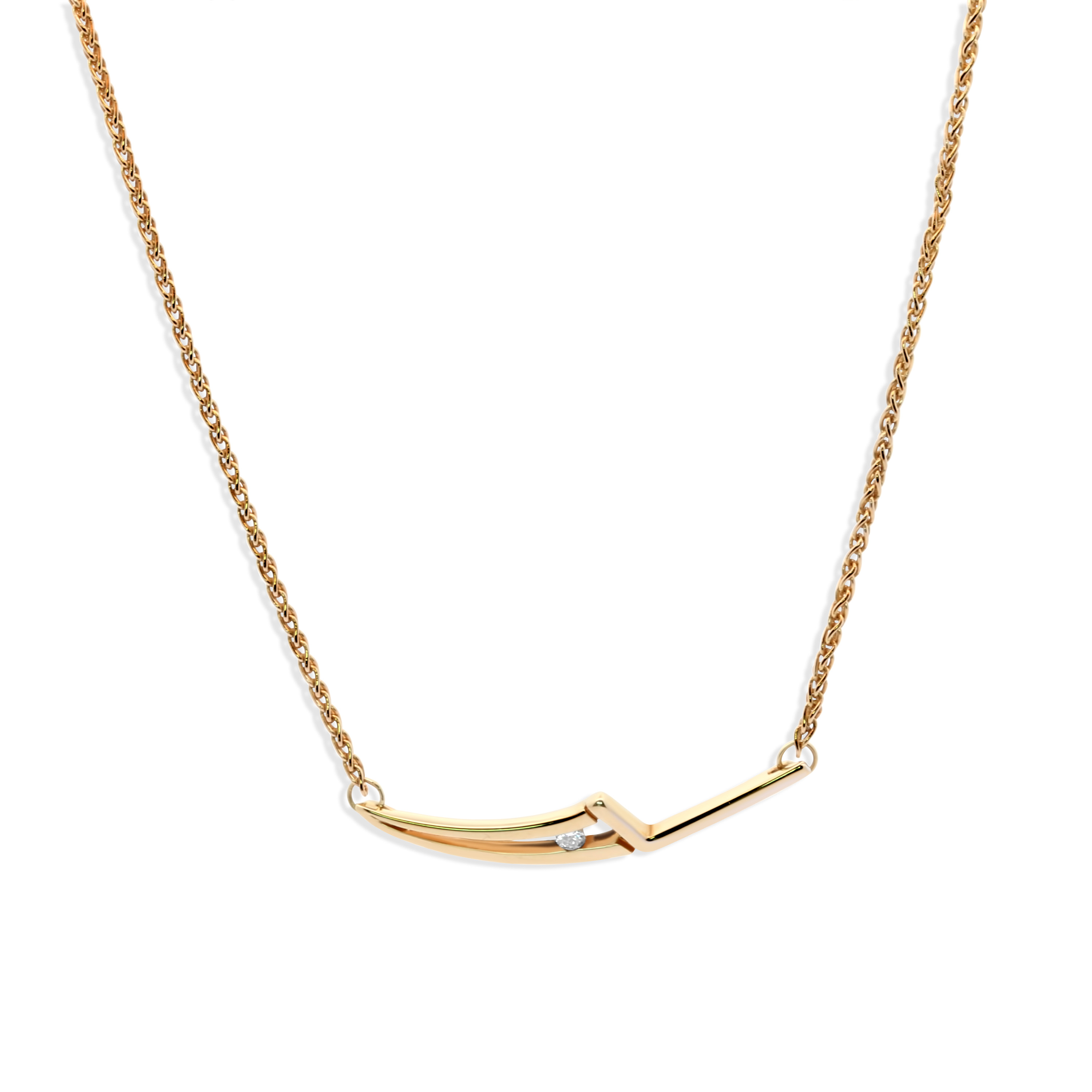 Voeg een vleugje verfijning toe aan je sieradencollectie met deze prachtige gouden ketting. Het moderne, gebogen design straalt elegantie uit. De ketting is perfect te combineren met zowel alledaagse outfits als met chique avondkleding.