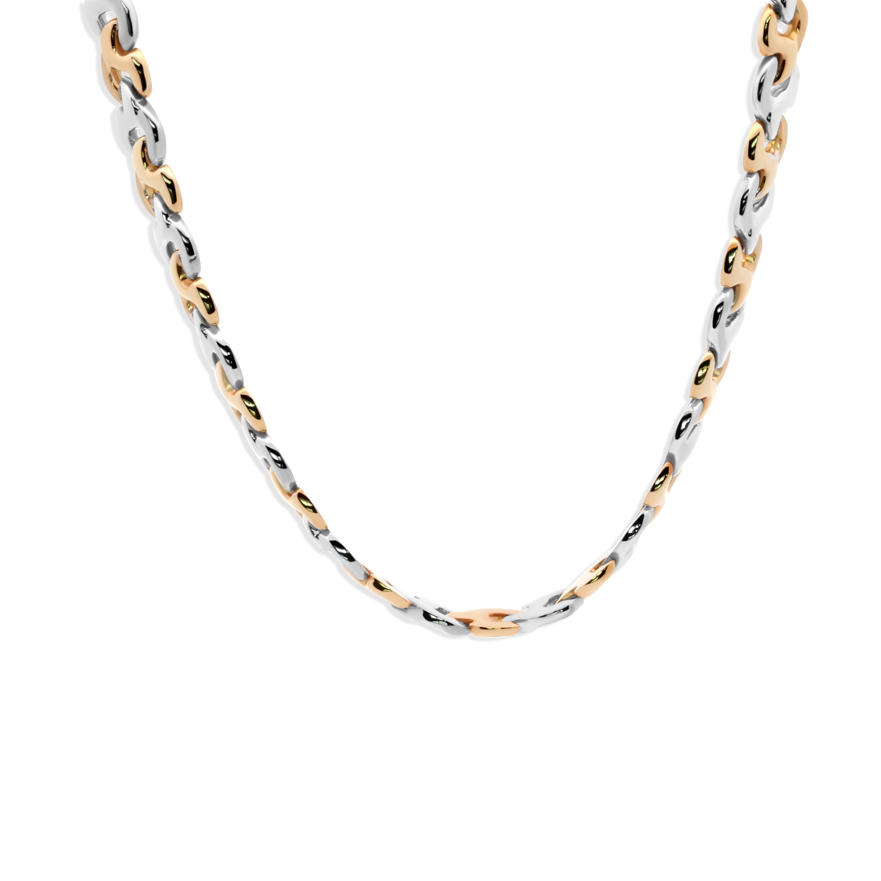 Deze prachtige tricolor ketting combineert de warme tinten van geelgoud, het frisse karakter van witgoud en de zachte gloed van roségoud. Het speelse samenspel van de drie goudsoorten zorgt voor een veelzijdig en stijlvol sieraad.
