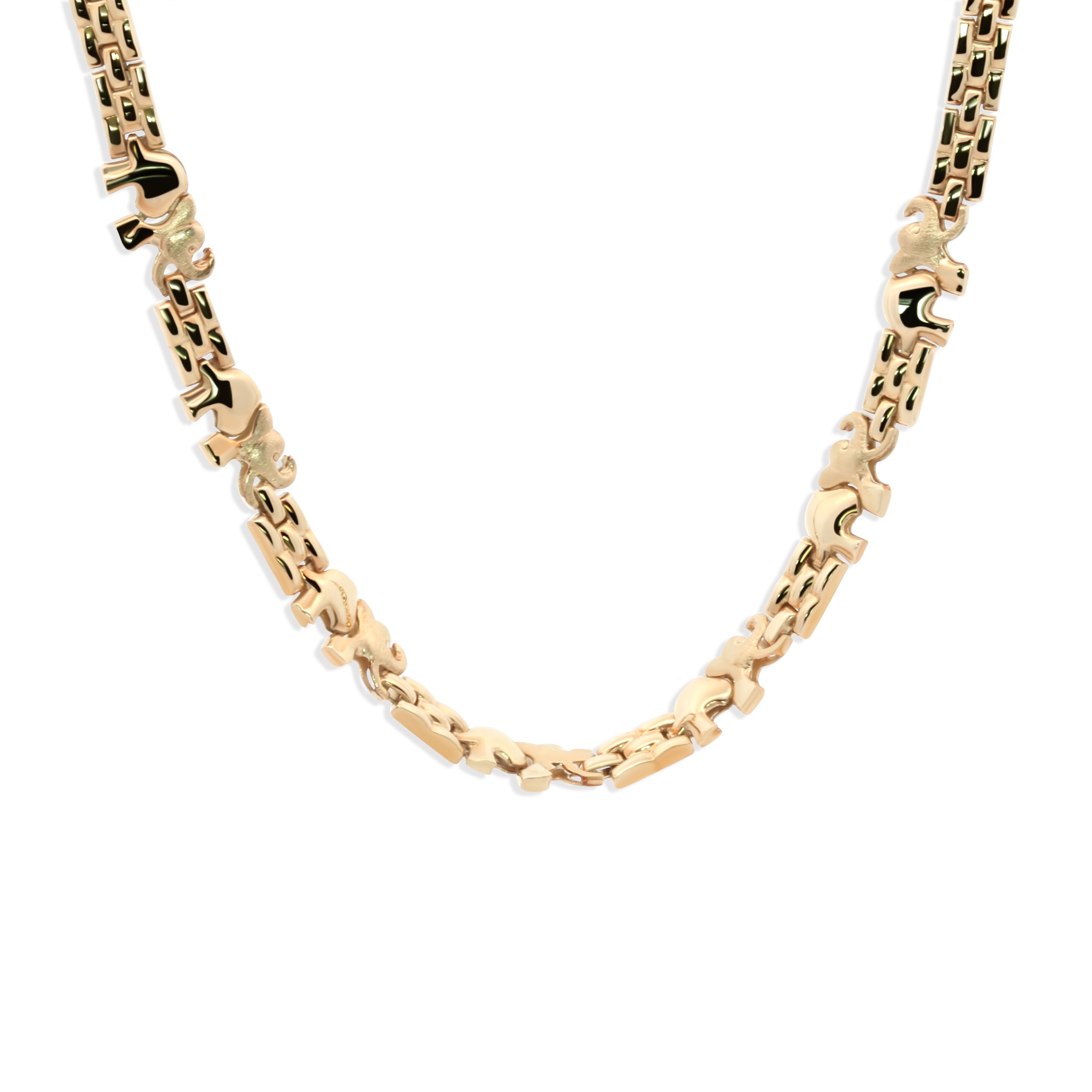 Speels en charmant: deze geelgouden ketting is versierd met kleine olifanten als bijzondere details, die symbool staan voor kracht, geluk en wijsheid. De warme goudkleur en het verfijnde ontwerp maken dit sieraad tot een unieke en betekenisvolle toevoeging aan je collectie.