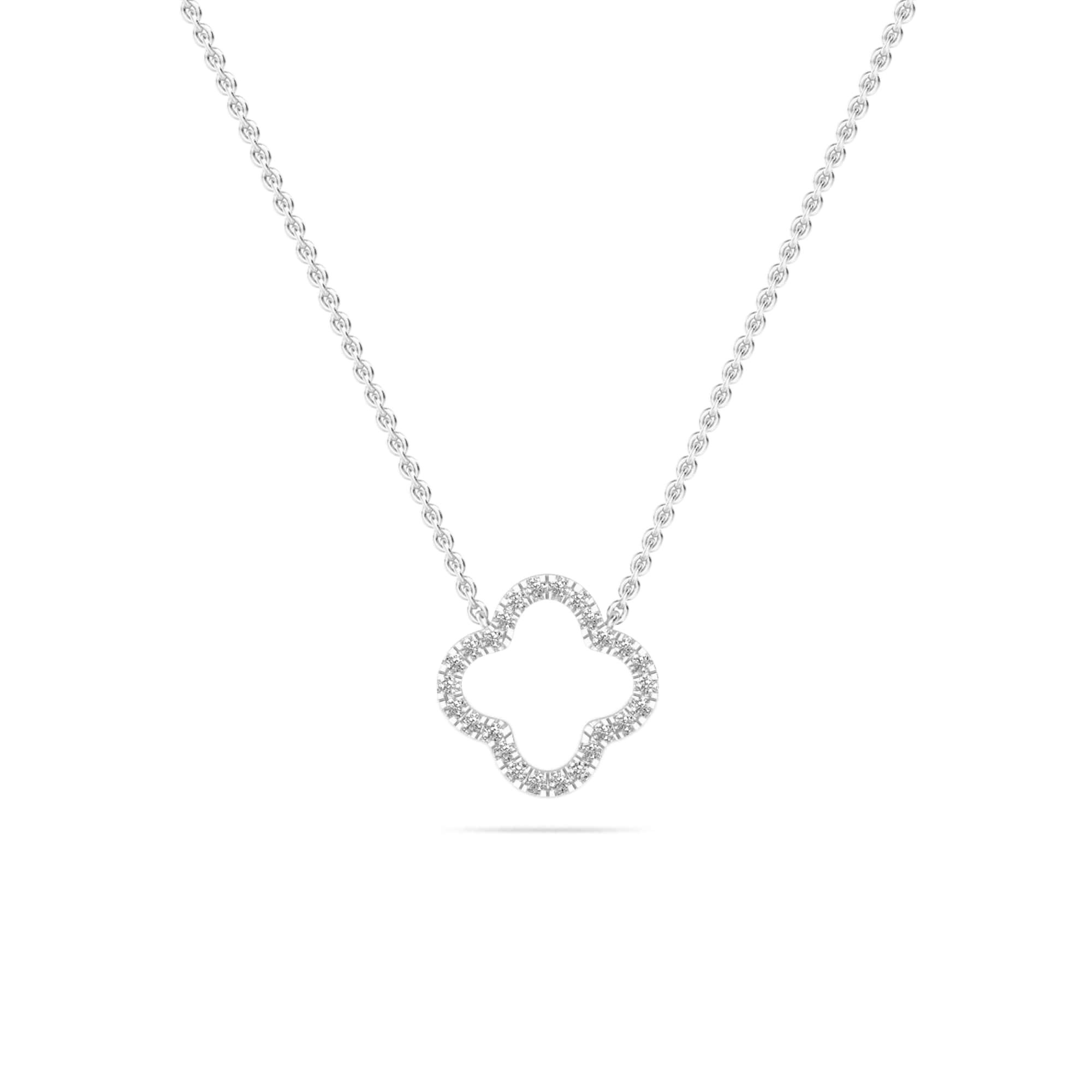 Voeg een vleugje luxe toe aan je sieradencollectie met deze verfijnde clover-hanger ketting, schitterend bezet met fonkelende diamanten. Het elegante klavervormige design symboliseert geluk, liefde en harmonie. Deze ketting is vervaardigd uit hoogwaardig witgoud.
