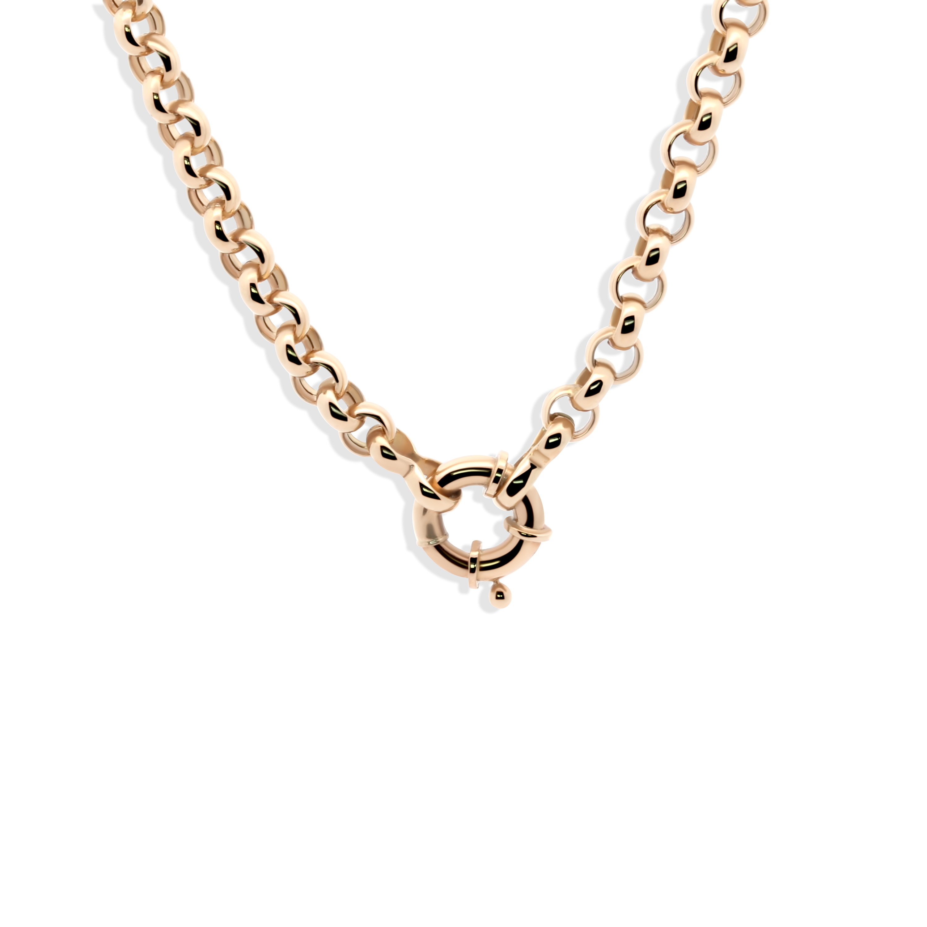 Deze verfijnde gouden schakelketting straalt pure elegantie uit. Het unieke ontwerp met gladde, symmetrische schakels en een klassieke veerringsluiting maakt dit sieraad tot een tijdloos pronkstuk.
