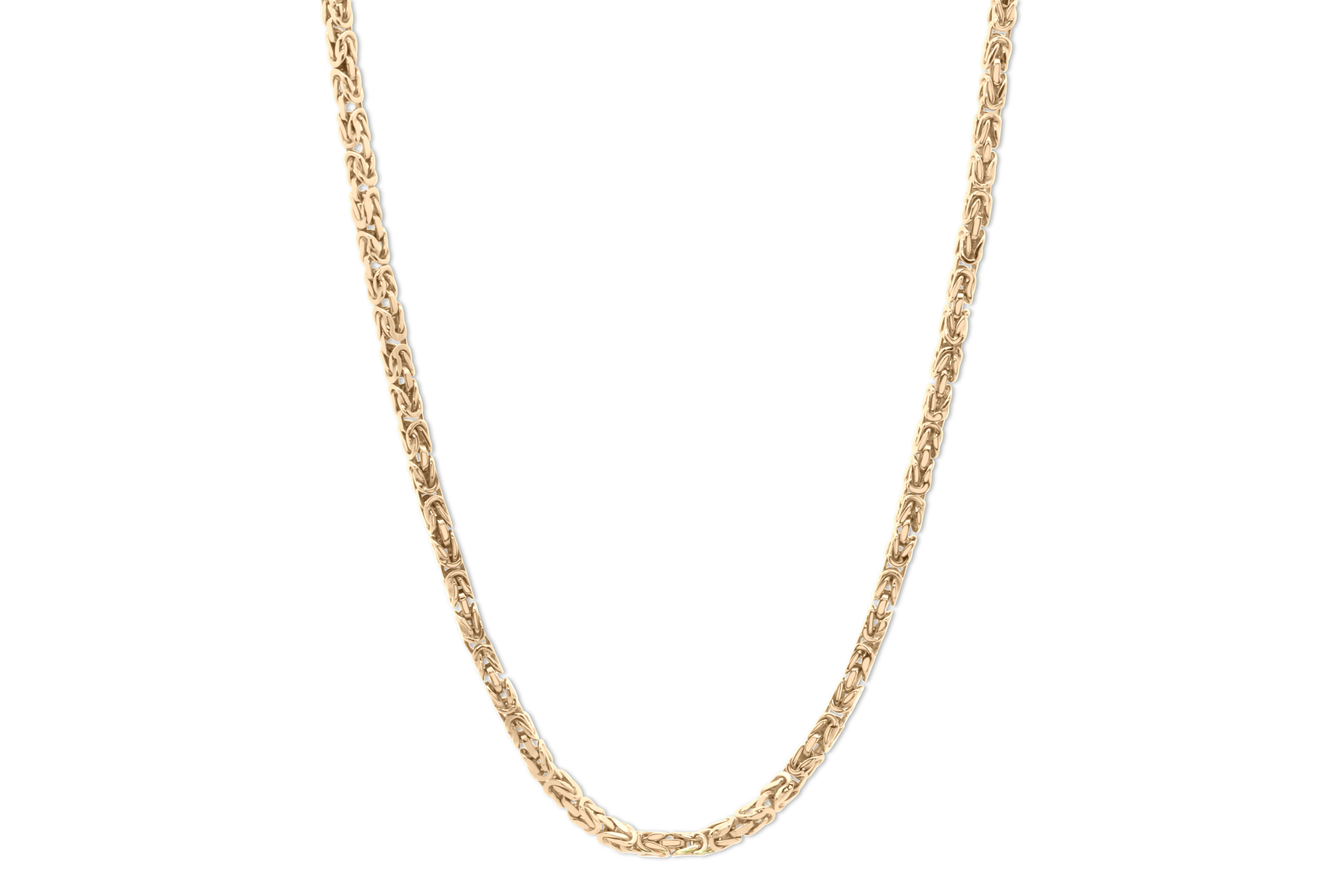 Geef jezelf een tijdloos statement met deze verfijnde 14 karaat geelgouden koningsketting. Het welbekende koningsschakel‑design—ook wel Byzantijnse stijl genoemd—straalt klassieke luxe uit. De stevige, vierkante schakels vormen samen een robuust en elegant geheel dat zowel modern als traditioneel oogt.