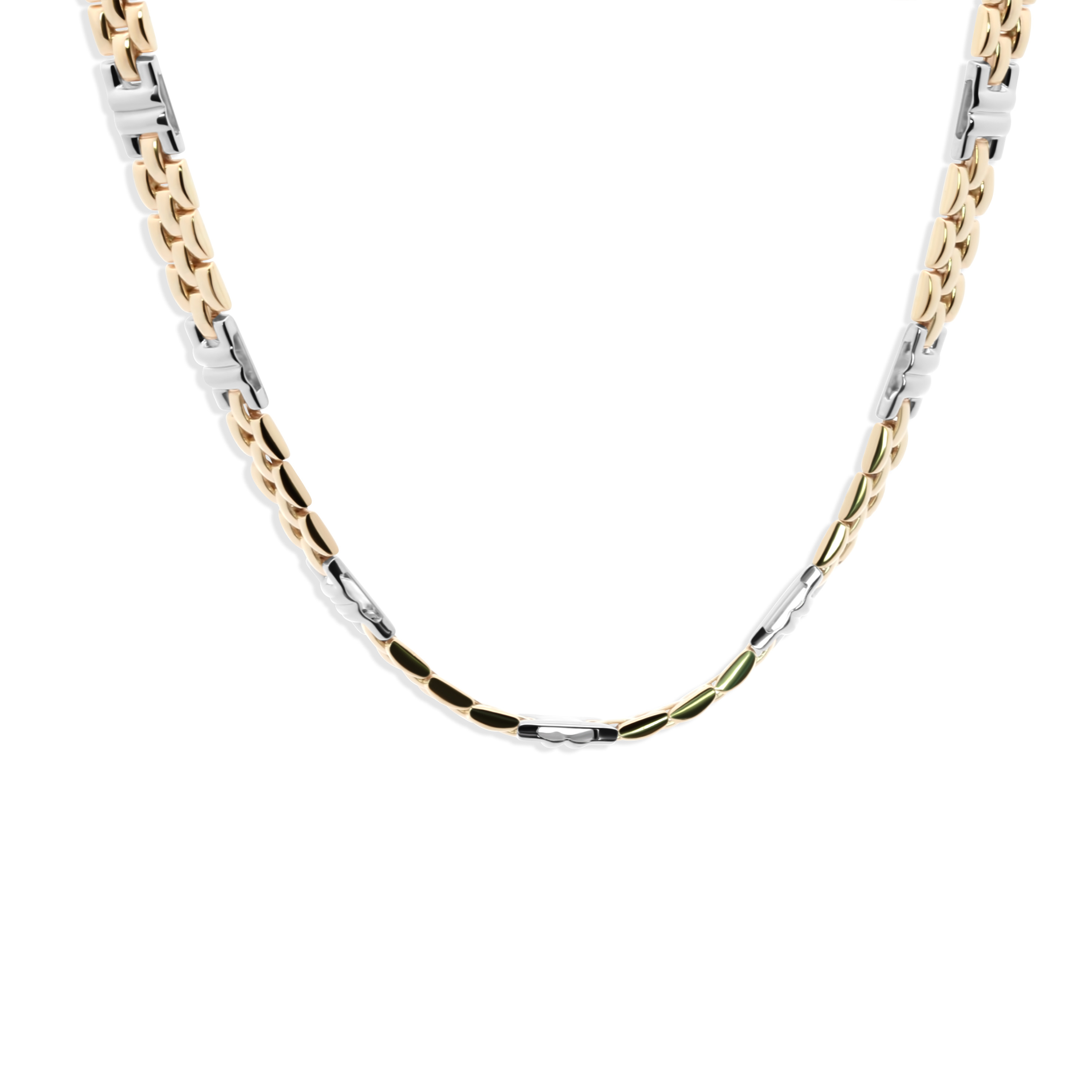 Deze verfijnde Rolex-ketting is vervaardigd uit 14 karaat wit- en geelgoud en combineert klassieke luxe met een moderne twist. De herkenbare Rolex-schakel geeft de ketting een stoere, maar toch elegante uitstraling, terwijl de combinatie van wit- en geelgoud zorgt voor een stijlvol en tijdloos contrast.