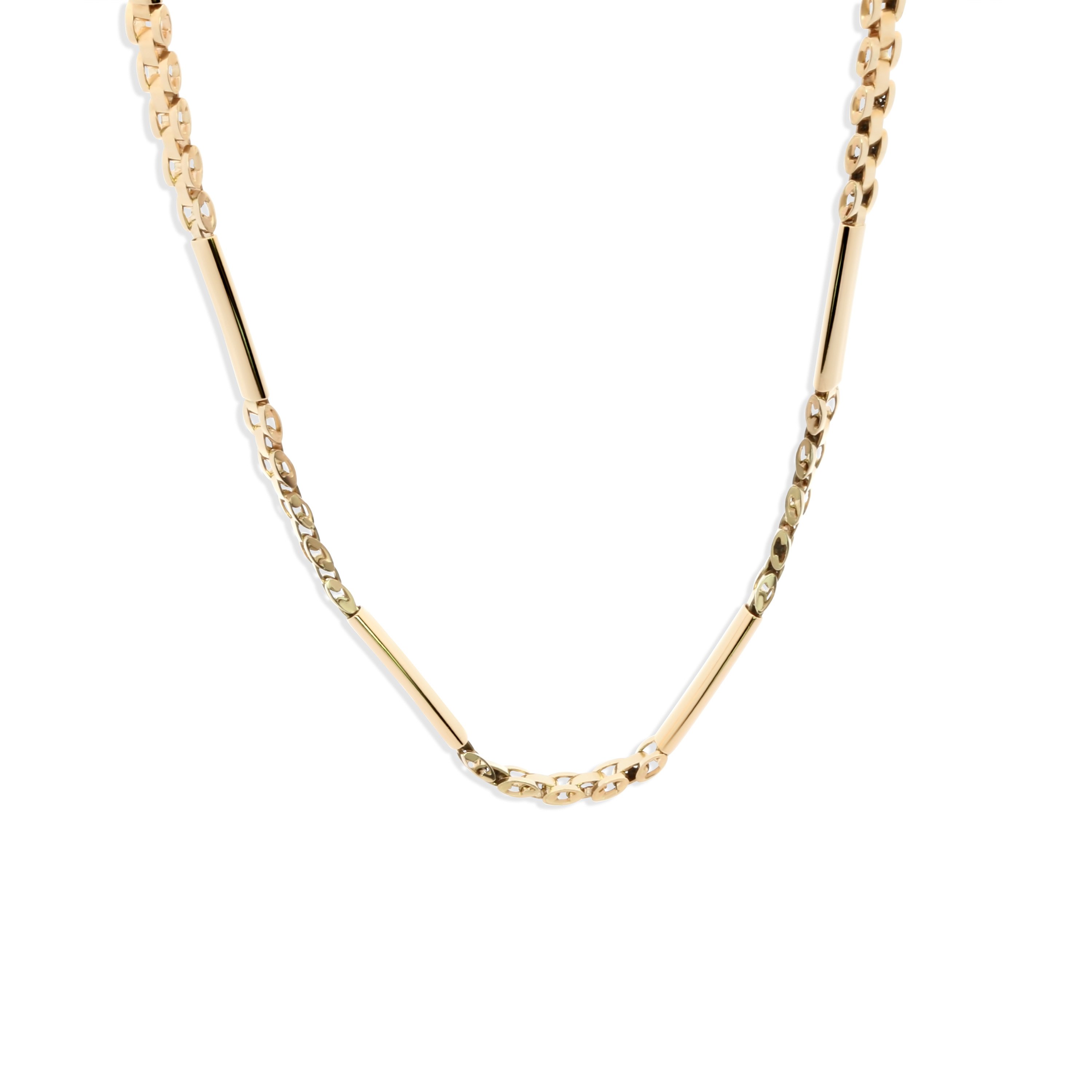 Deze stijlvolle Rolex ketting is gemaakt van 14 karaat geelgoud en heeft een kenmerkende, luxueuze schakelstructuur. De fijne afwerking en stevige uitstraling maken dit sieraad tot een echte klassieker. Met een lengte van 45 cm draagt de ketting comfortabel en valt deze mooi rond de hals.