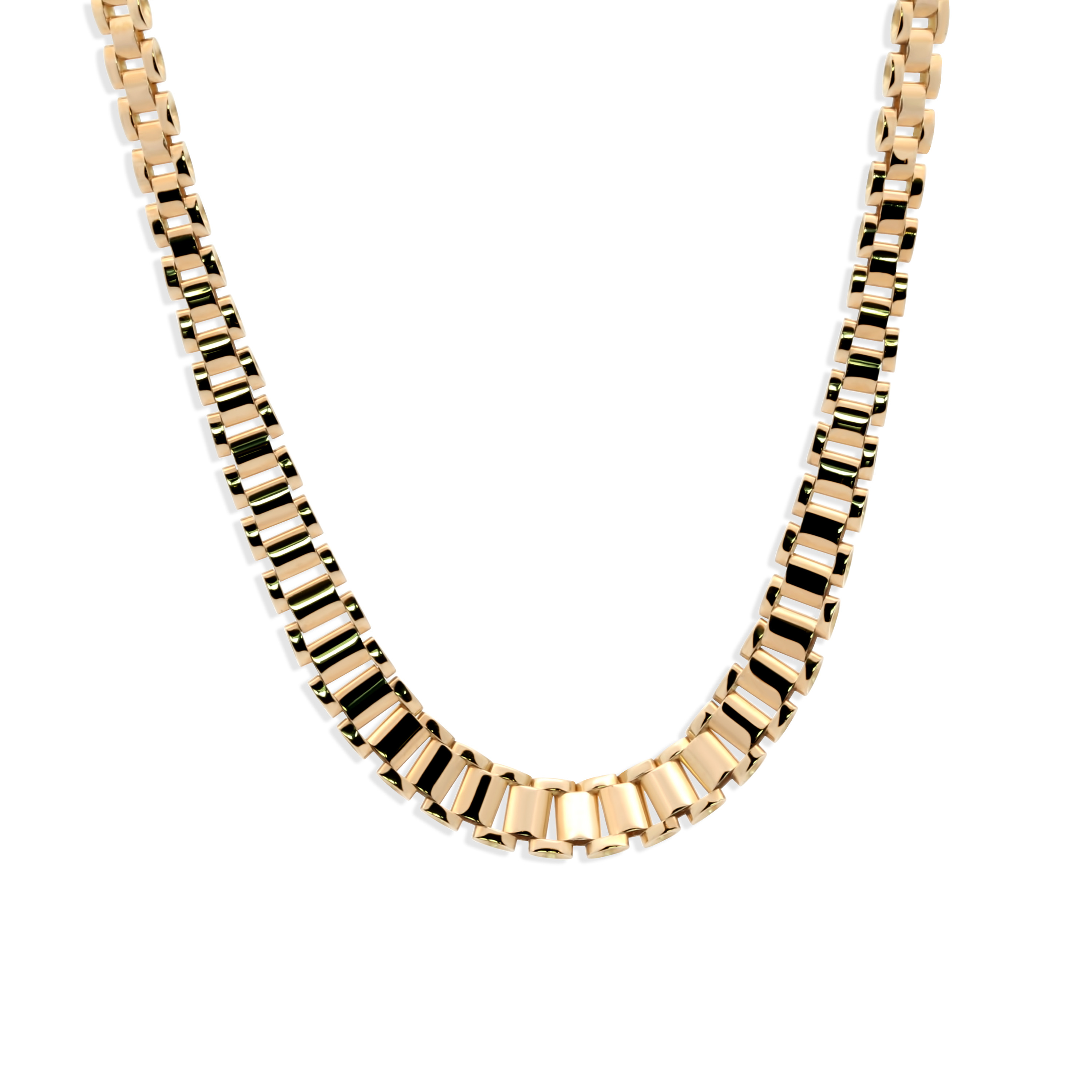 Deze luxe geelgouden ketting in de iconische Rolex-schakel is een echte blikvanger. Vervaardigd uit 14 karaat goud. De schakels zijn stevig en elegant, met een schakellengte van 47 mm, wat zorgt voor een krachtige, maar verfijnde uitstraling.