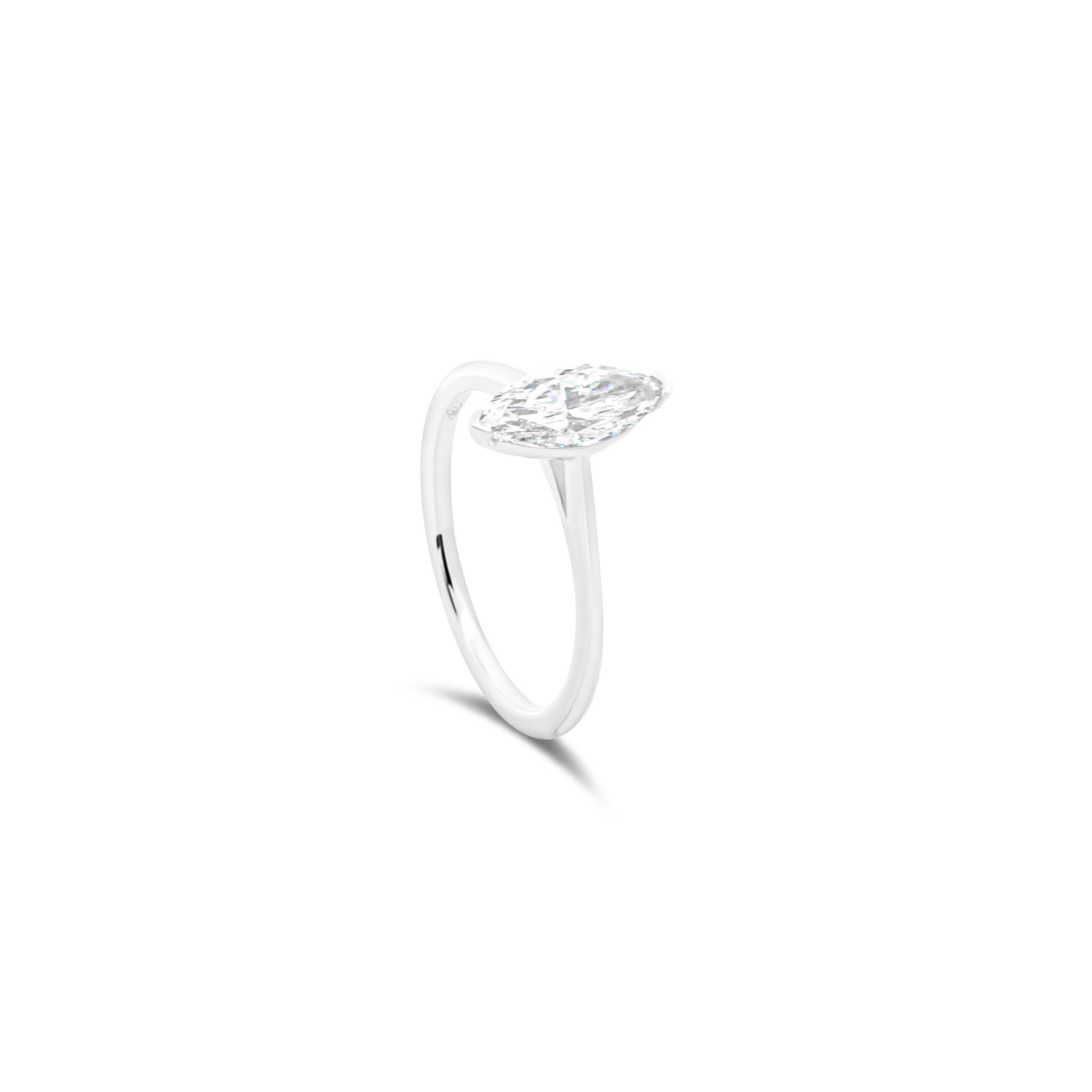 Deze verfijnde ring van witgoud is bezet met een schitterende 1,00 ct witte lab-grown diamant in een elegante marquise slijpvorm. Het unieke, langwerpige design van de diamant accentueert de schittering en zorgt voor een opvallende, tijdloze uitstraling. Perfect voor wie op zoek is naar een stijlvol en duurzaam sieraad met een klassieke touch.