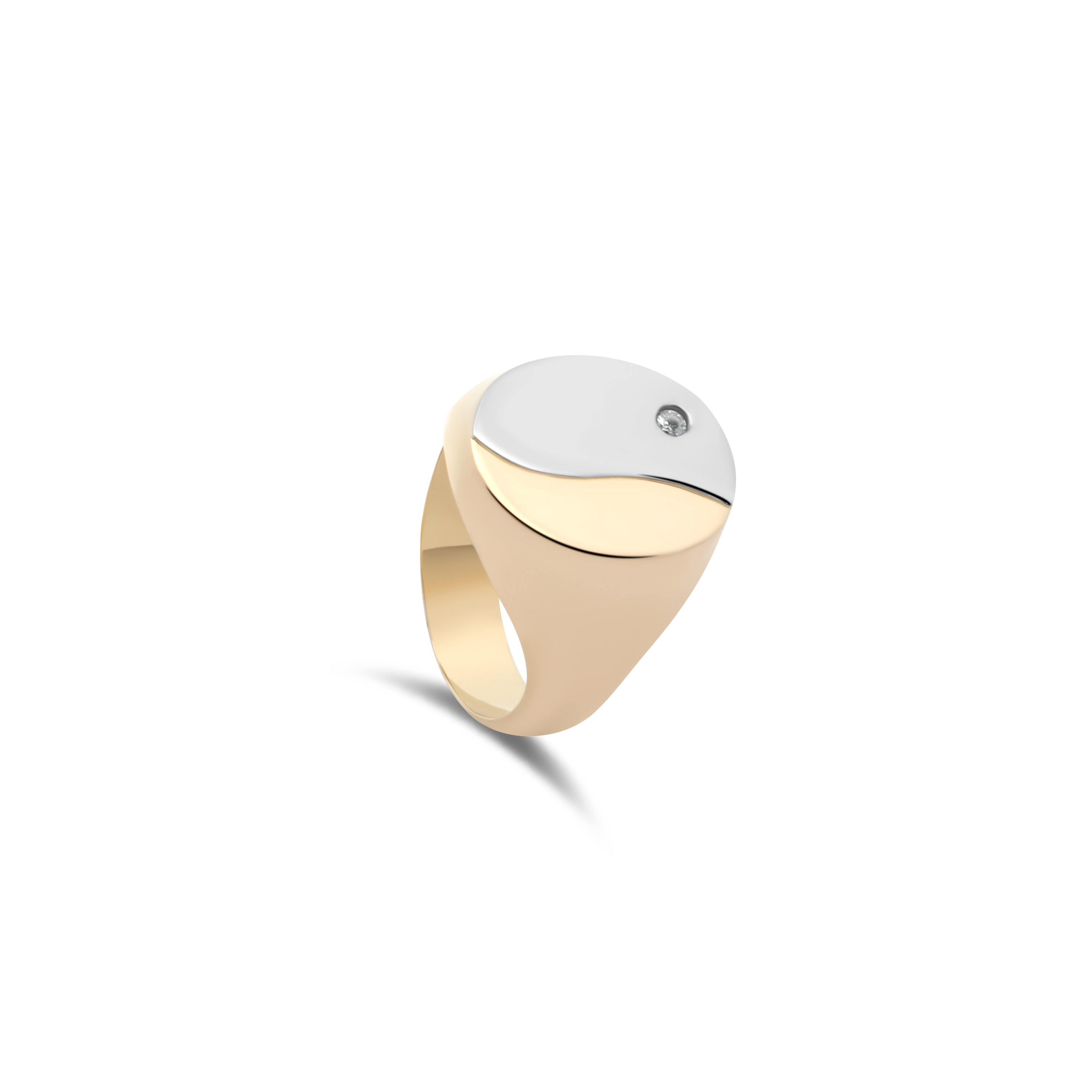 Deze verfijnde ring combineert warm geelgoud met koel witgoud en is gezet met een schitterende natuurlijke witte diamant van 0,05 ct. Het tijdloze ontwerp benadrukt de helderheid en pracht van de diamant, waardoor het sieraad een elegante en veelzijdige uitstraling krijgt. Perfect voor dagelijks dragen én speciale gelegenheden.