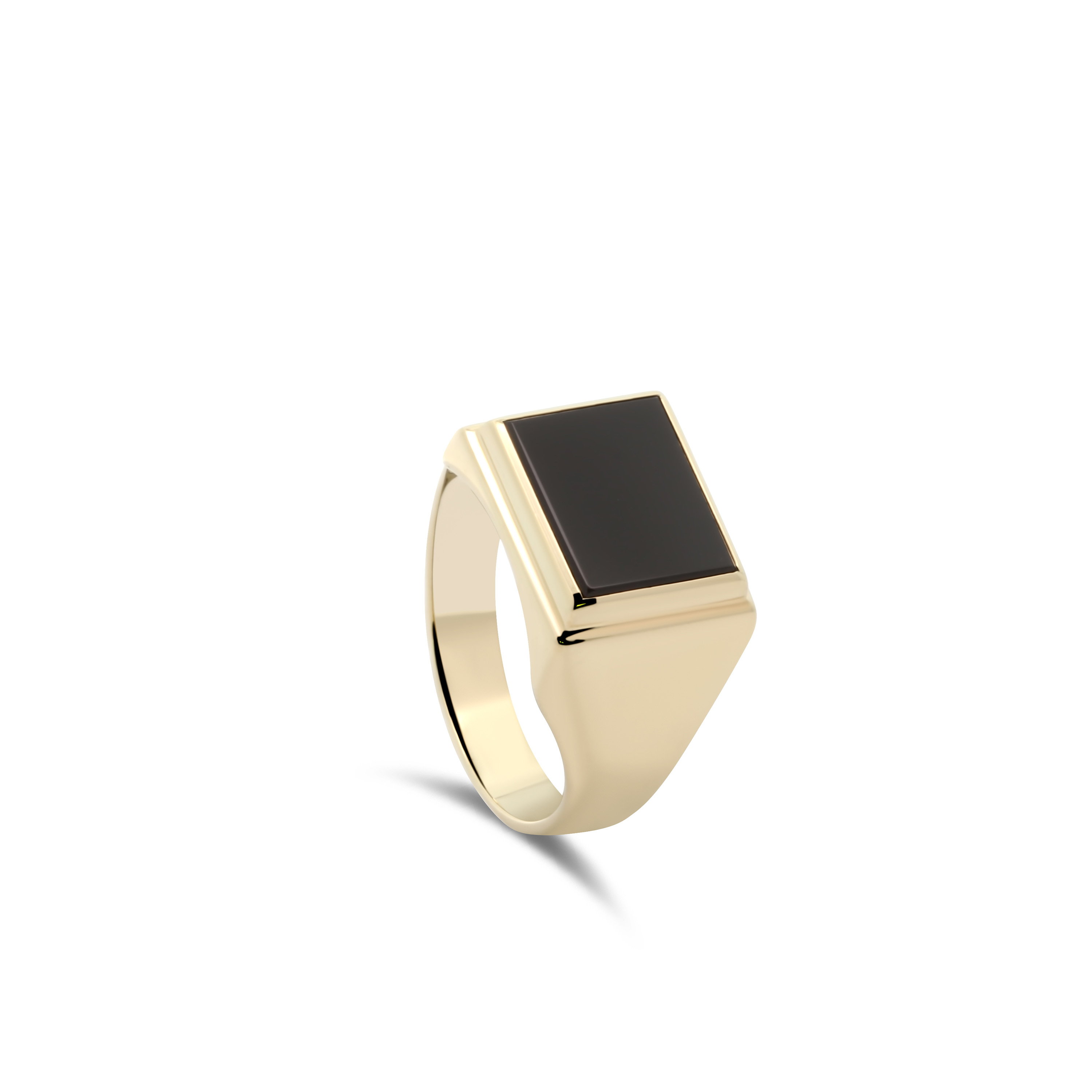 Deze stijlvolle geelgouden ring is uitgerust met een natuurlijke zwarte onyx, die een diepe en krachtige uitstraling geeft. Het warme goud vormt een prachtig contrast met de intense zwarttint van de steen, waardoor het sieraad zowel elegant als tijdloos is. Perfect voor wie houdt van verfijnde accessoires met karakter.