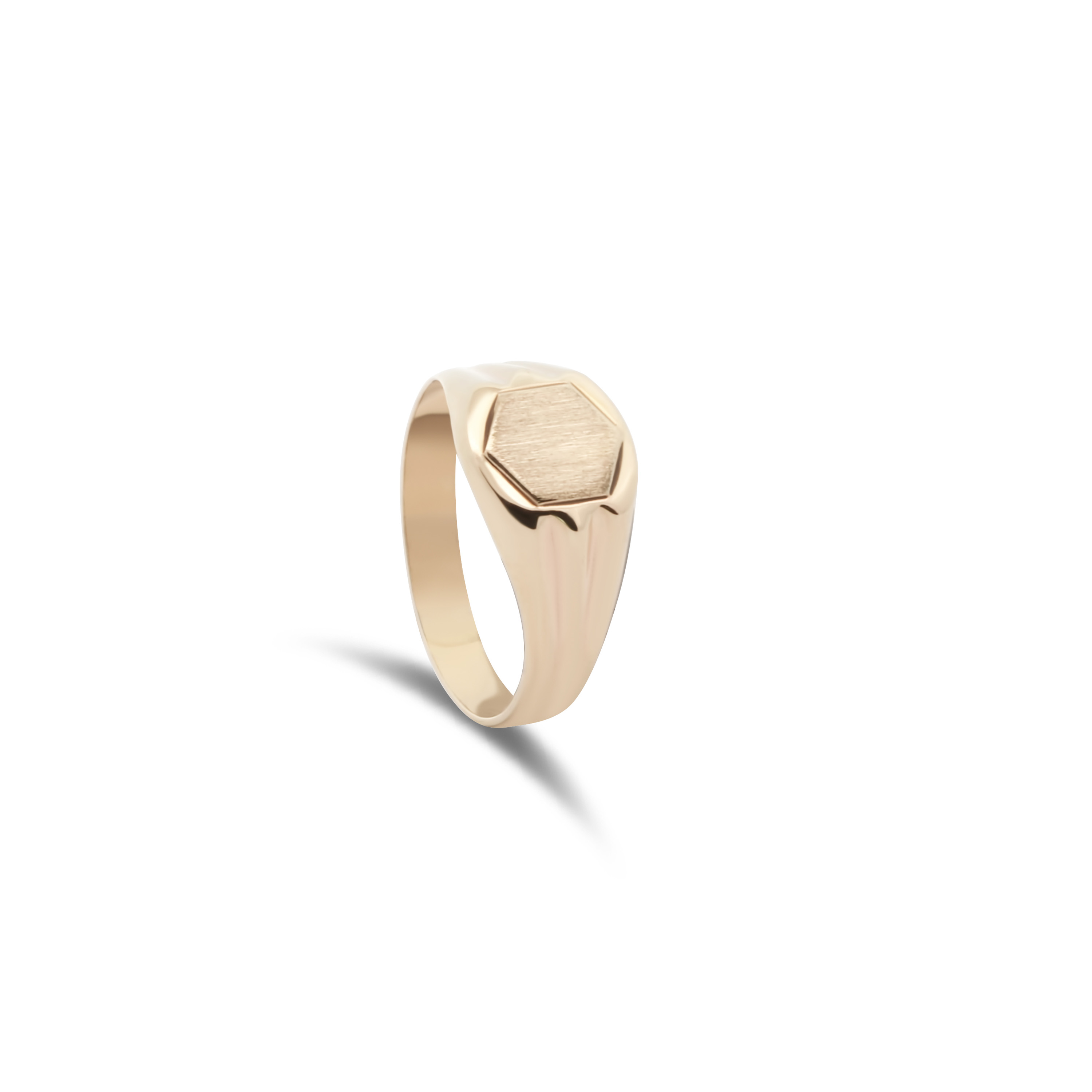 Deze stijlvolle geelgouden ring heeft een matte afwerking met een opvallende zeshoekige vorm in het midden. Het eigentijdse ontwerp combineert moderne geometrie met een verfijnde uitstraling, waardoor het sieraad perfect is voor de man of vrouw die houdt van unieke, subtiele details.