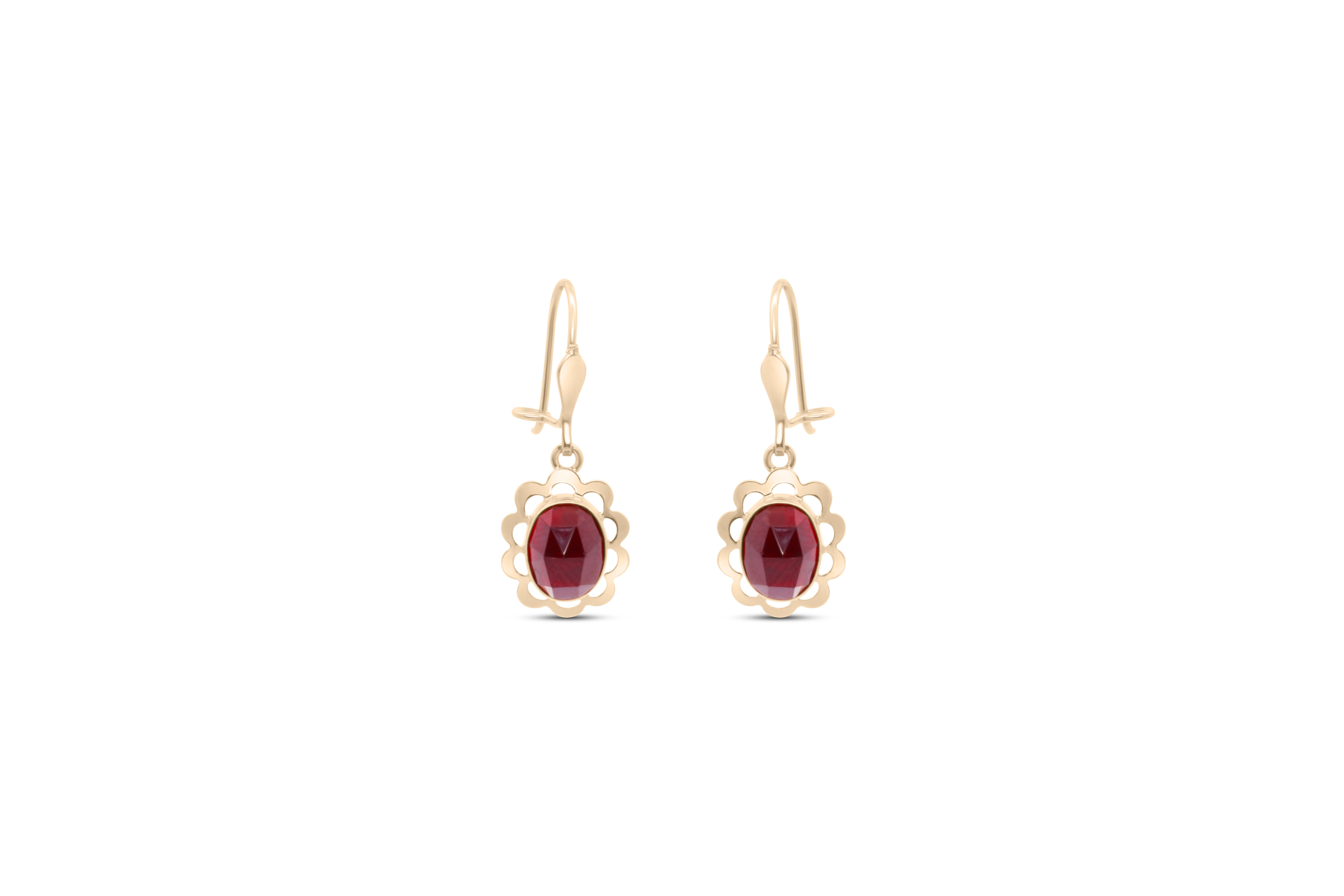 Deze stijlvolle Franse haakoorbel is vervaardigd uit 14 karaat geelgoud en is bezet met twee dieprode granaatstenen. De warme kleur van de granaat contrasteert prachtig met het glanzende geelgoud en geeft het sieraad een klassieke, krachtige uitstraling.