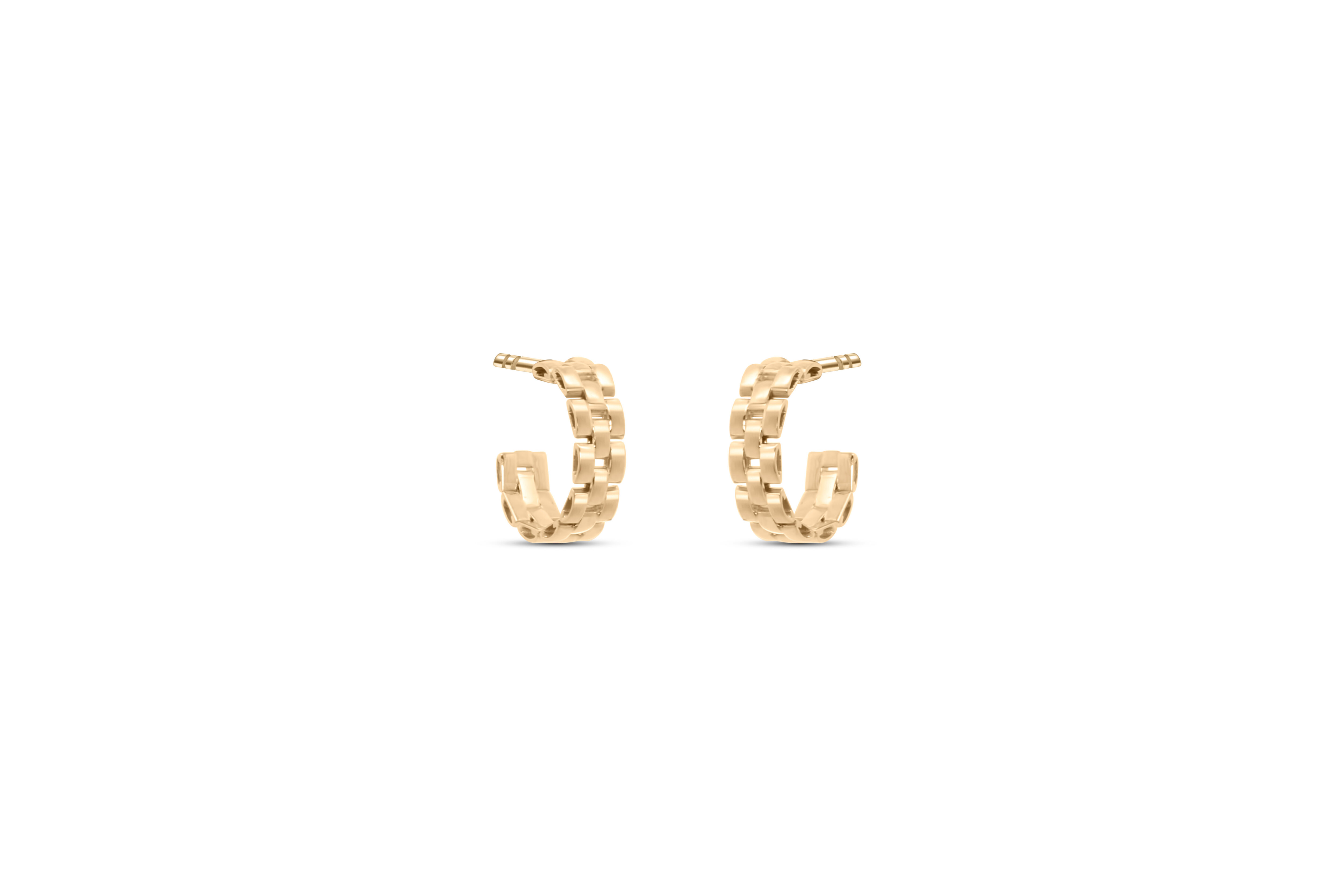Deze oorbel van 14 karaat geelgoud is geïnspireerd op de iconische Rolex-schakel en combineert een stoere uitstraling met tijdloze elegantie.
