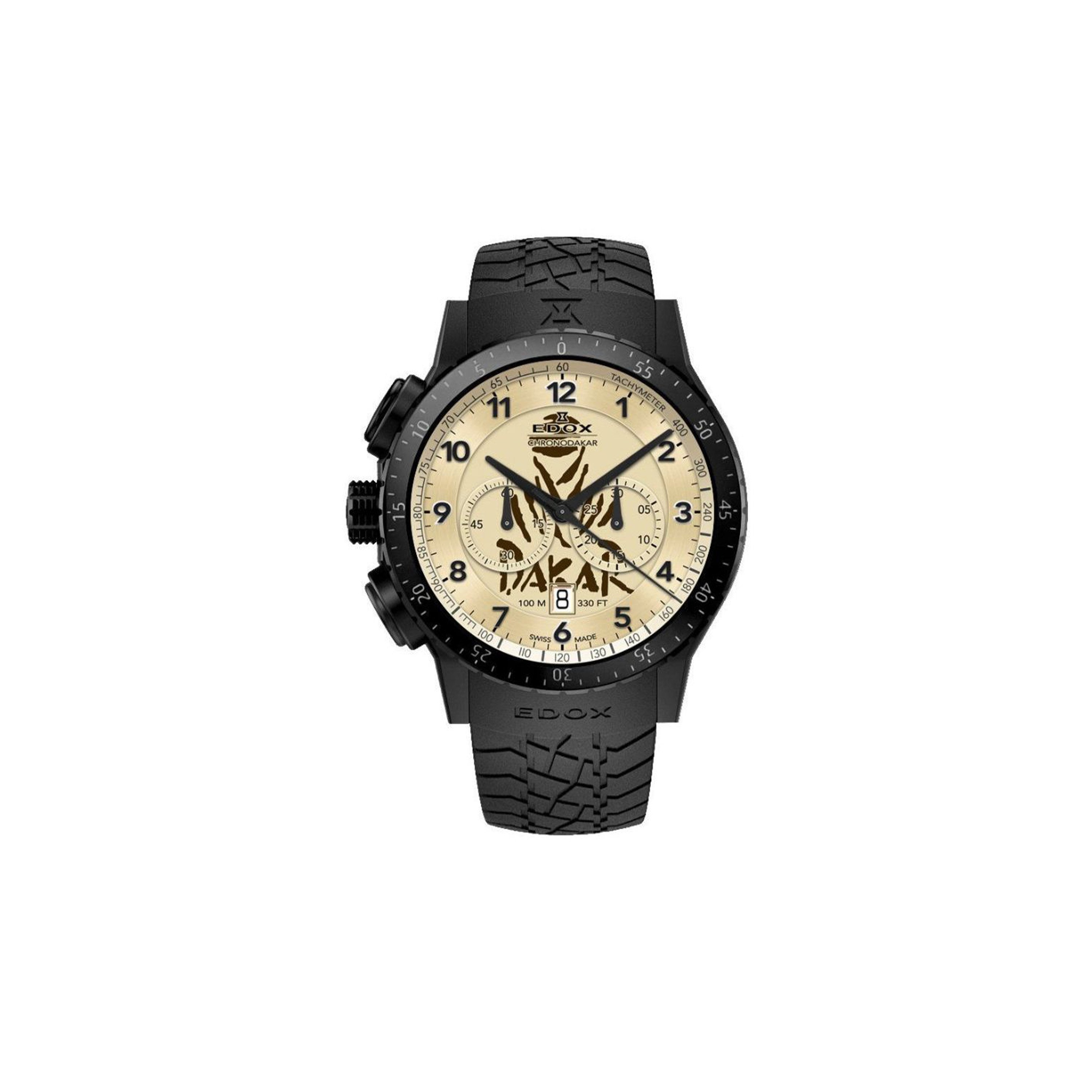 Het Edox Chronodakar horloge is Swiss Made en waterbestendig tot 100 meter (330 ft). Het heeft een zwarte band met een unieke voertuigbandenprint, wat het een stoere en avontuurlijke uitstraling geeft.