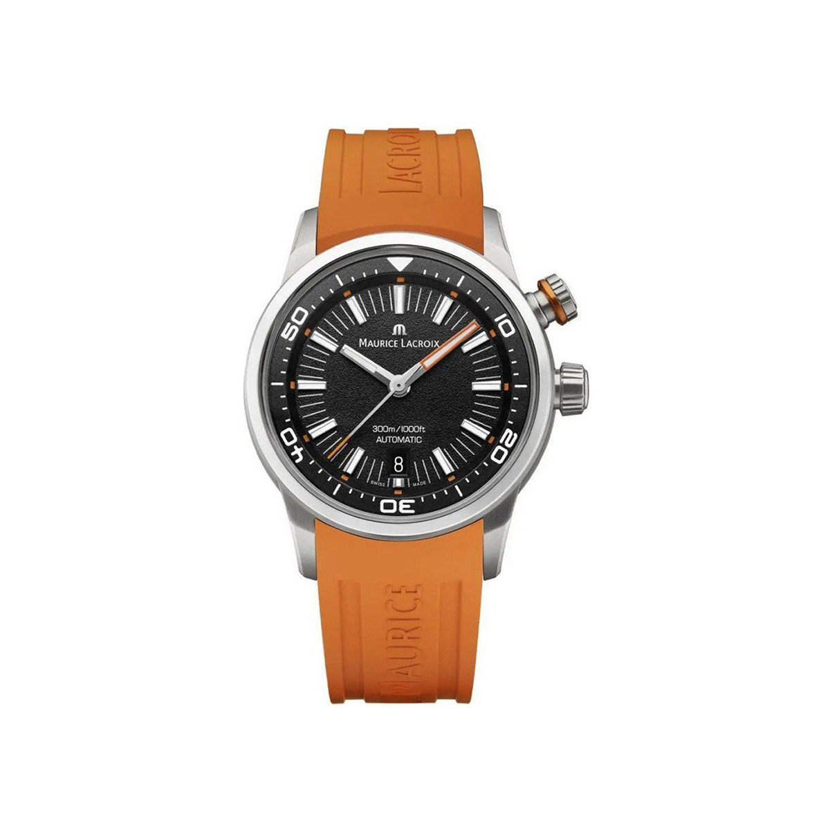 De Maurice Lacroix Pontos S Diver is een luxe automatisch duikhorloge met een robuuste 42 mm stalen kast en een waterdichtheid tot 300 meter. Het horloge wordt geleverd met een opvallende oranje rubberen band én een extra nylon band. Dit model combineert verfijnde afwerking met hoogwaardige materialen en staat symbool voor elegante functionaliteit en toegankelijke luxe. Perfect voor zowel duikavonturen als stijlvol dagelijks gebruik.