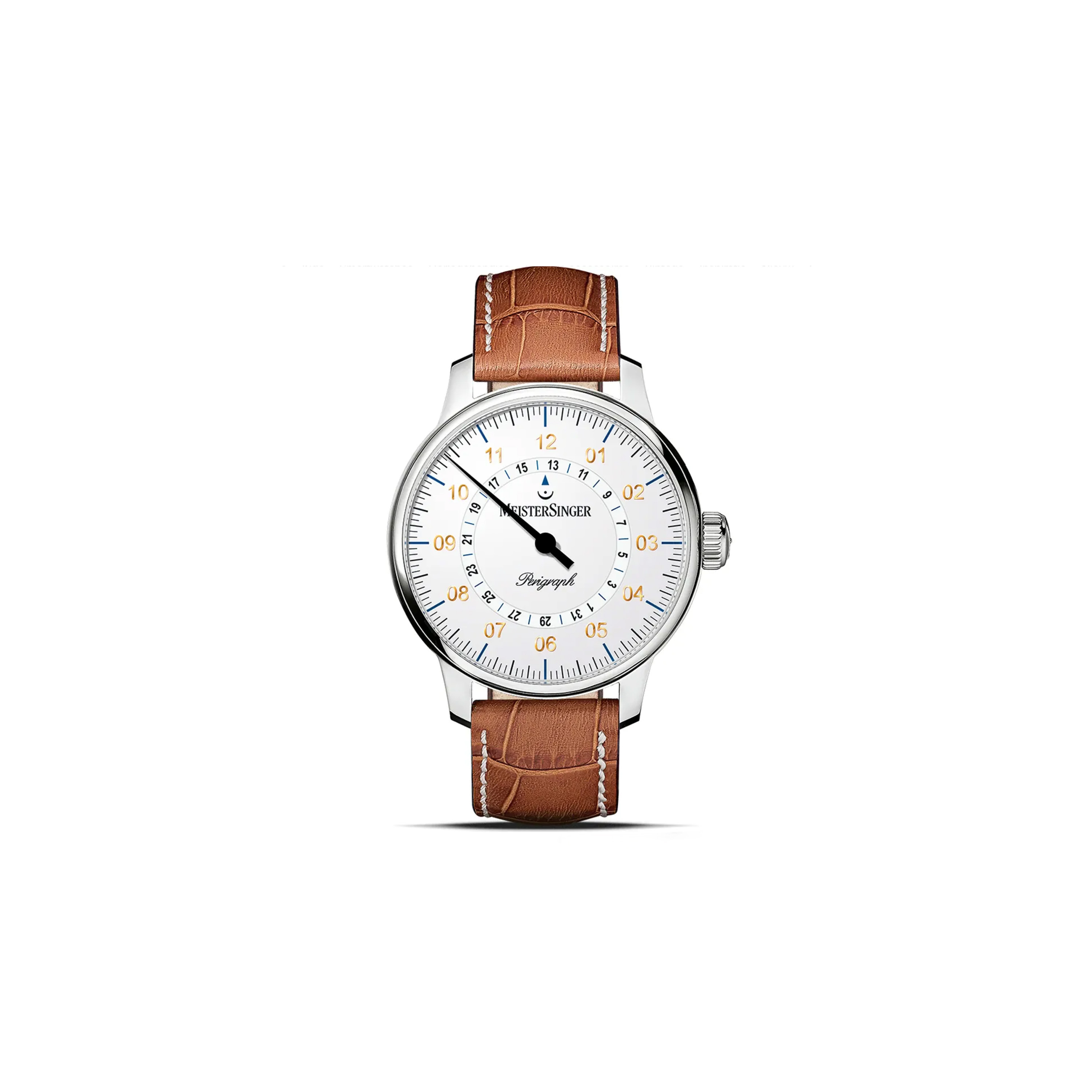Dit MeisterSinger horloge heeft een bruine leren band met print en een witte wijzerplaat, afgewerkt met blauwe en gouden details voor een elegante en karaktervolle uitstraling.