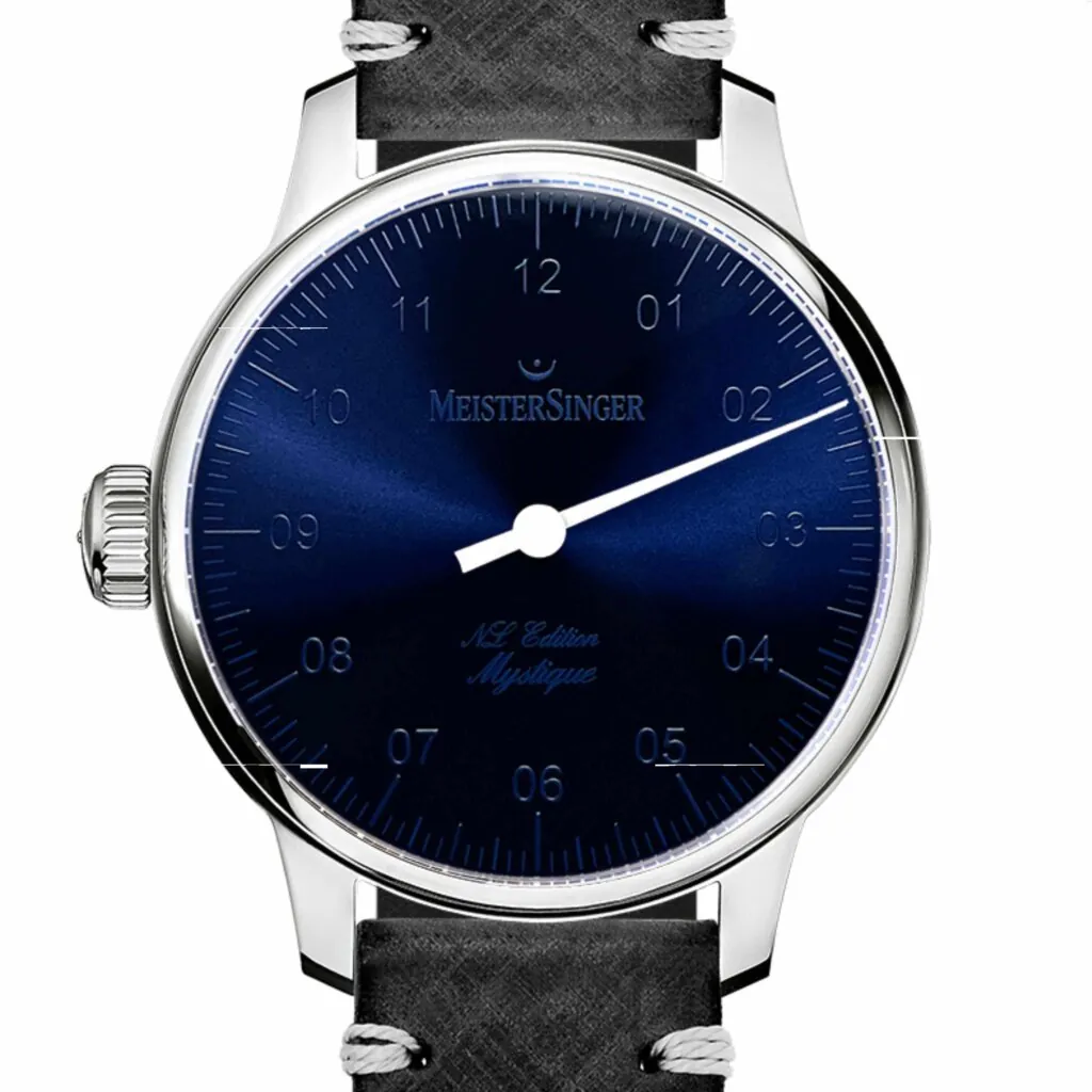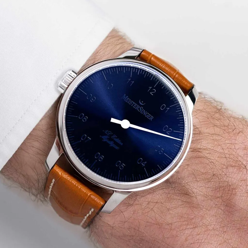Dit MeisterSinger horloge heeft een opvallende gele leren band met wit stiksel en een diepe donkerblauwe wijzerplaat, wat samen een kleurrijk en stijlvol contrast vormt. Horloge wordt geleverd inclusief zwart lederen band.