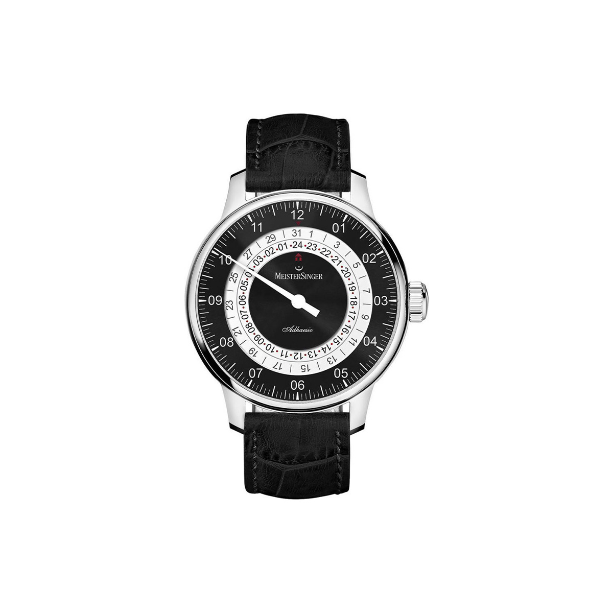 De MeisterSinger Adhaesio is een uniek horloge dat de kenmerkende éénwijzertechniek combineert met een tweede tijdzone. De scherp gevormde uurwijzer geeft de lokale tijd weer met een nauwkeurigheid van vijf minuten, terwijl een 24-uurs ring – zichtbaar boven het logo – een tweede tijdzone toont. Het doordachte ontwerp en de minimalistische esthetiek maken de Adhaesio tot een typisch MeisterSinger-model: elegant, functioneel en eigenzinnig in zijn tijdsbeleving. Perfect voor wie stijlvol reist en het concept tijd net iets anders bekijkt.