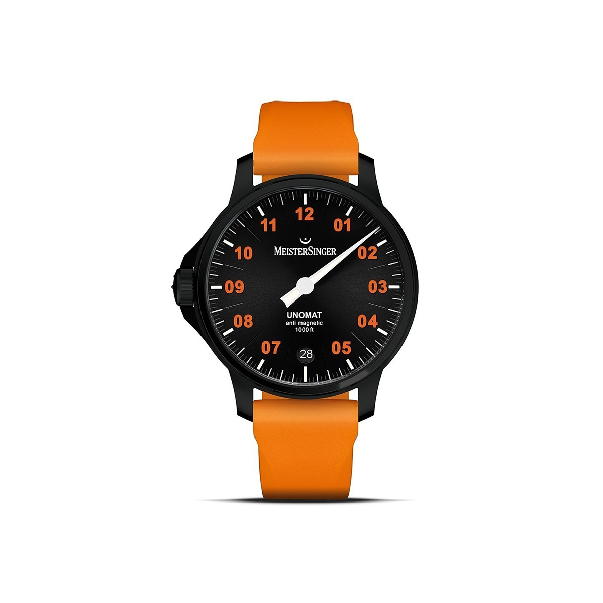 MeisterSinger NL Edition 2024 Unomat ED-NL24 – gelimiteerd tot 50 stuks. Dit sportieve horloge heeft een zwarte DLC-stalen kast, matte zwarte wijzerplaat met oranje accenten en een robuuste oranje rubberen band. Met schroefkroon, 30 bar waterdichtheid, magnetische bescherming en een automatisch Sellita SW400 uurwerk met 38 uur gangreserve. De kroon zit aan de linkerkant, speciaal voor de Nederlandse editie. Swiss Made kwaliteit van het Duitse merk MeisterSinger.