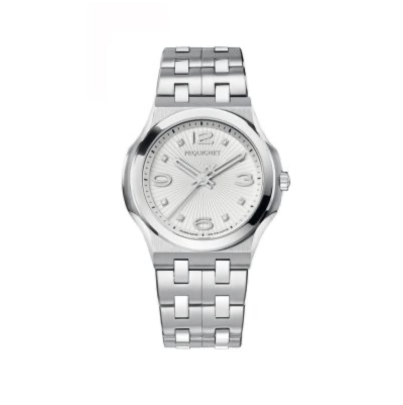 Dit elegante dameshorloge uit de Moorea Ranelagh collectie van Pequignet heeft een zilverkleurige, ronde edelstalen kast met een diameter van 34 mm. De zilverkleurige wijzerplaat is voorzien van schitterende diamanten en wordt beschermd door krasbestendig saffierglas. Het horloge werkt op een nauwkeurig quartz-uurwerk en is waterbestendig tot 50 meter (5 ATM). De bijpassende zilverkleurige edelstalen band heeft een handige vouwsluiting voor comfortabel dragen. Een stijlvol en tijdloos accessoire voor elke gelegenheid.