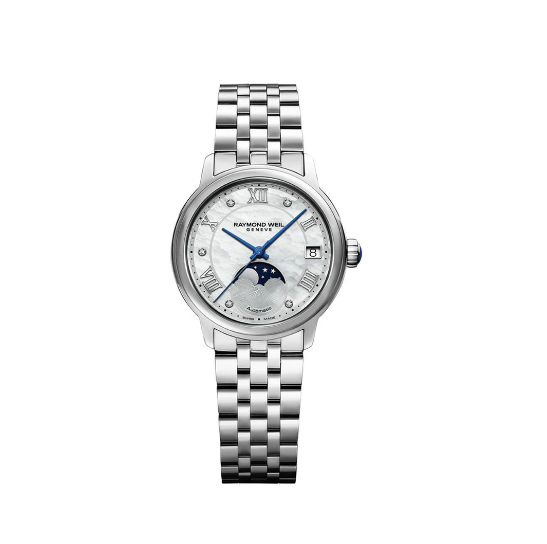 Prachtig dameshorloge van RAYMOND WEIL met een parelmoer wijzerplaat en een zilverkleurige metalen horlogeband. Het horloge heeft een zilverkleurige roestvrijstalen horlogekast en is voorzien van een Quartz uurwerk.
