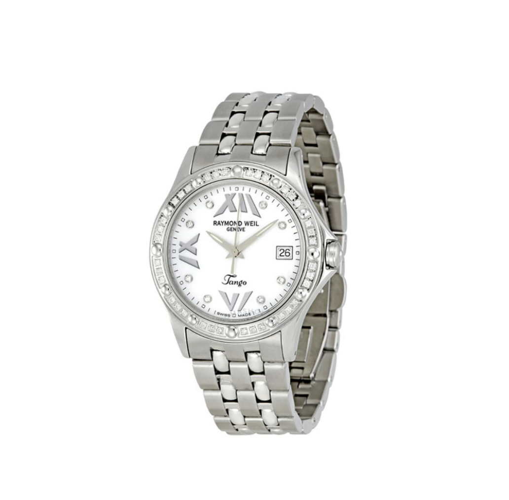 Dit zilverkleurige Raymond Weil horloge straalt elegantie en klassieke schoonheid uit, met subtiele diamantdetails op de wijzerplaat die het geheel een verfijnde en luxueuze uitstraling geven. Een tijdloos sieraad dat stijl en verfijning perfect combineert.