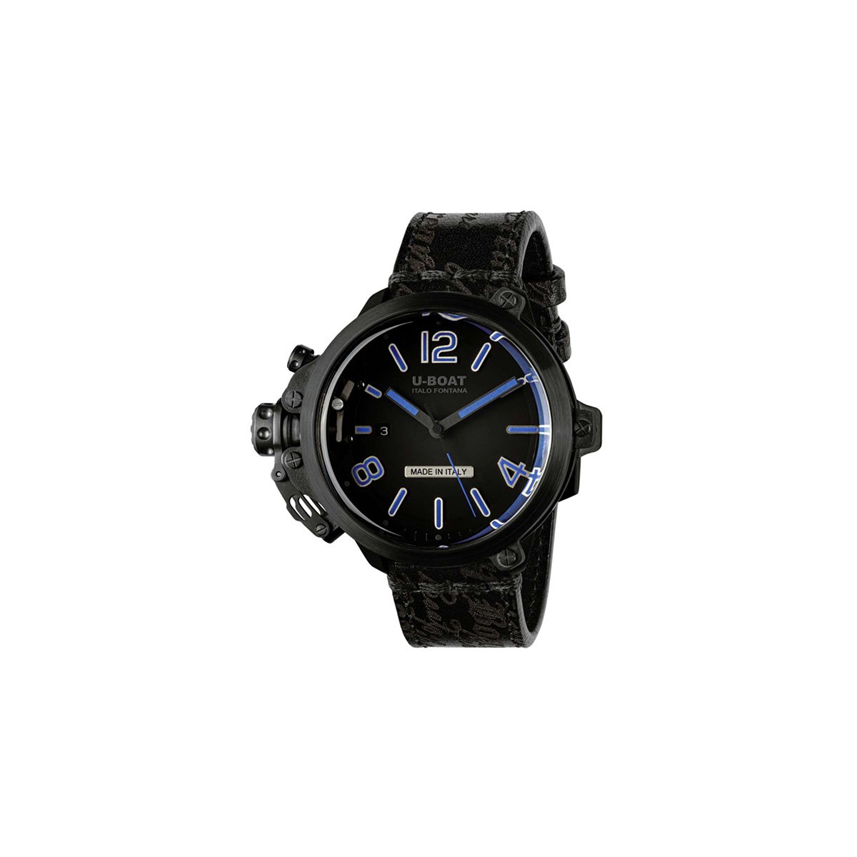 Dit stoere, volledig zwarte U-Boat horloge combineert een matzwarte kast met een zwarte leren band waarop een subtiele tekst is gegraveerd voor extra karakter. De blauwe accenten op de cijfers geven het ontwerp een frisse, moderne touch. Het krasbestendige saffierglas en de robuuste bouw maken het horloge zowel stijlvol als duurzaam. Perfect voor wie houdt van een elegante, maar krachtige look.