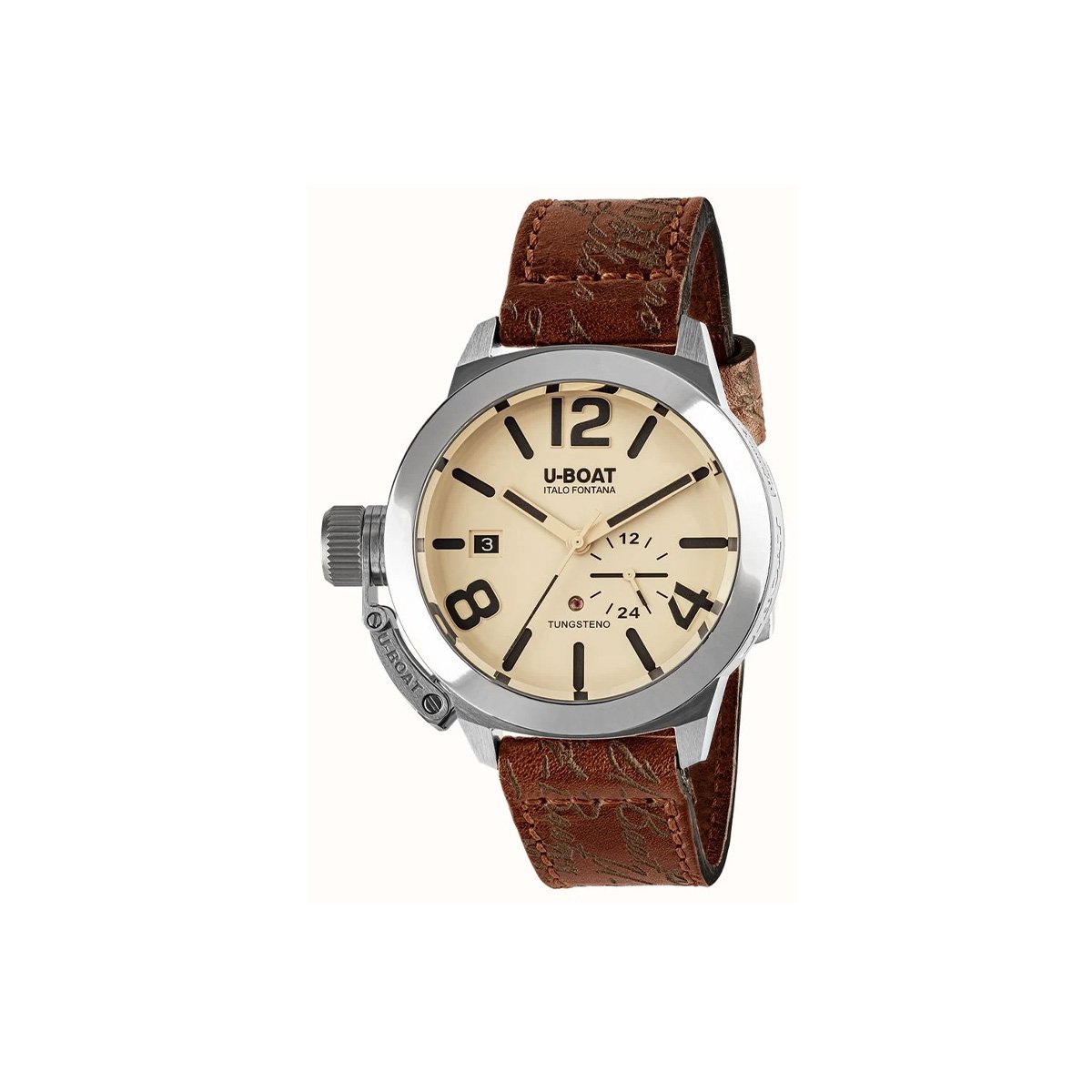 Het U-Boat Capsule horloge van Italo Fontana kenmerkt zich door een stevige stalen kast en een zwarte leren band met verfijnde tekstdetails. Dit model biedt een perfecte balans tussen stoer design en tijdloze klasse, ideaal voor de moderne horlogeliefhebber.